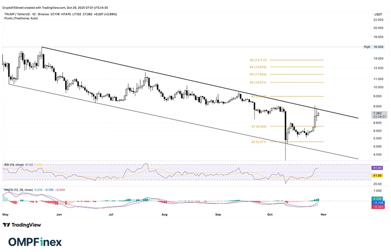 ارز دیجیتال Official Trump (میمکوین رسمی مرتبط با رئیسجمهور آمریکا) در زمان نگارش مطلب نزدیک به ۳ درصد رشد داشته و خود را برای ثبت هفتمین کندل مثبت متوالی آماده میکند. این توکن در حال نزدیک شدن به یک خط روند مقاومتی کلیدی در ۷/۷۰ دلار است و در صورتی که با موفقیت از این سطح عبور کند، شکست کانال نزولی آن تایید میشود و قیمت میتواند به سمت ۸/۹۷۳ دلار حرکت کند.