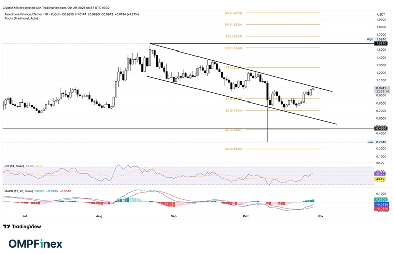 این موضوع باعث شد قیمت توکن AERO تا ۸ درصد رشد داشتهباشد. حال در صورتی که قیمت این رمزارز بالاتر از سطح ۱ دلار تثبیت شود، الگوی کانال نزولی (Falling Channel) را باطل میکند و هدف بالقوه ۱/۲۶۸۷ دلار (نقطه پیووت R1) را در دسترس قرار میدهد.
