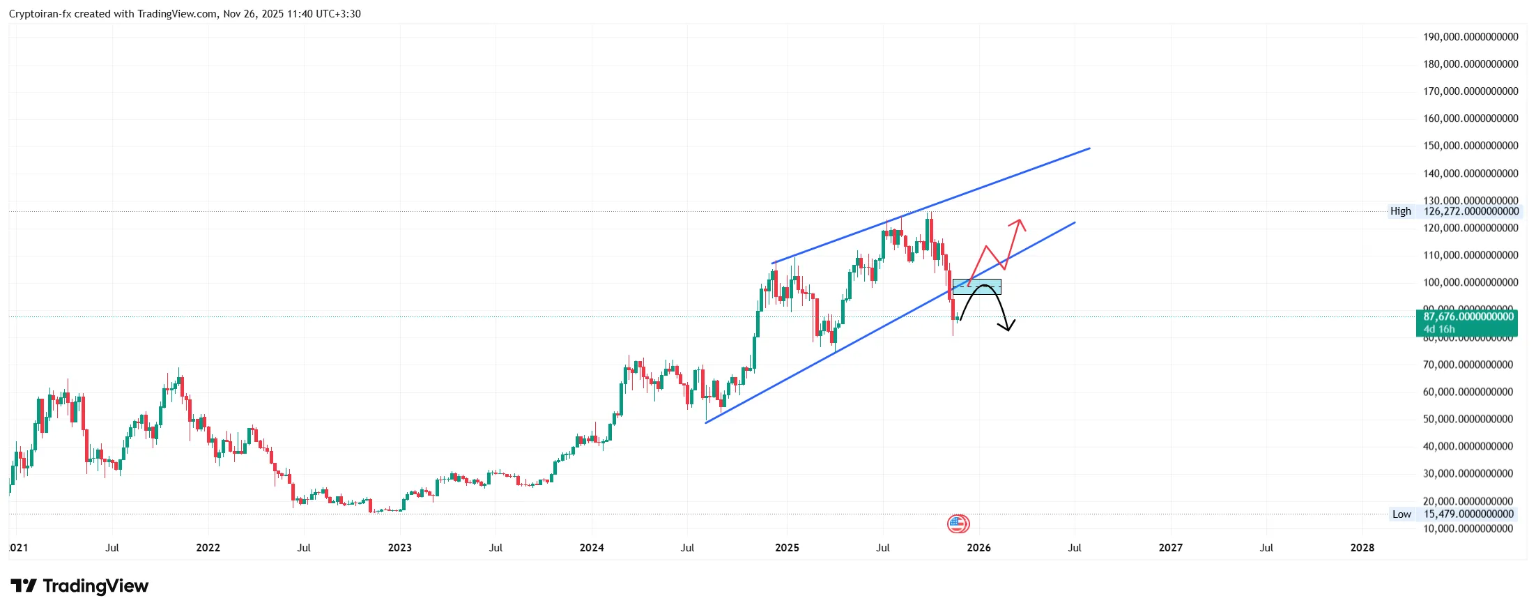بیت کوین در تایمفریم هفتگی هنوز در روند صعودی قوی قرار داره. اگه نگاهی به الگوهای تاریخی داشته باشیم، موقعی که بیت کوین از سطح ۳۱ هزار دلار تا ۲۴ هزار دلار کاهش داشت، تونست خط روند صعودی خودش رو بشکنه و مومنتوم فروش زیادی رو وارد بازار کنه. بعدش بیت کوین با فشردگی کوتاه مدت تونست از سطح تقاضا حمایت بشه و به سمت ناحیه ۵۰ هزار دلار حرکت کنه. در حال حاضر هم این الگو مجدد تکرار شده؛ قیمت از سطح ۱۲۶ هزار دلار با ریزش شدید مواجه شد و تونست خط روند صعودی خودش رو از دست بده. ناحیه حمایتی ۸۴ تا ۸۲ هزار دلار میتونه حکم سطح ۲۴ تا ۲۶ هزار دلار در گذشته رو داشته باشه که باعث رشد خیره کننده قیمت شد. این سناریو تا زمانی معتبره که قیمت سطح ۸۴ تا ۸۹ هزار دلار رو در تایمفریم هفتگی از دست نده. همچنین لیکوییدیهای بزرگی روی سطح ۱۰۲ تا ۱۰۷ هزار دلار وجود داره که اگه قیمت به اون نواحی برسه، پوزیشنهای شورت زیادی لیکویید میشه که احتمال وقوع این اتفاق هم زیاده.