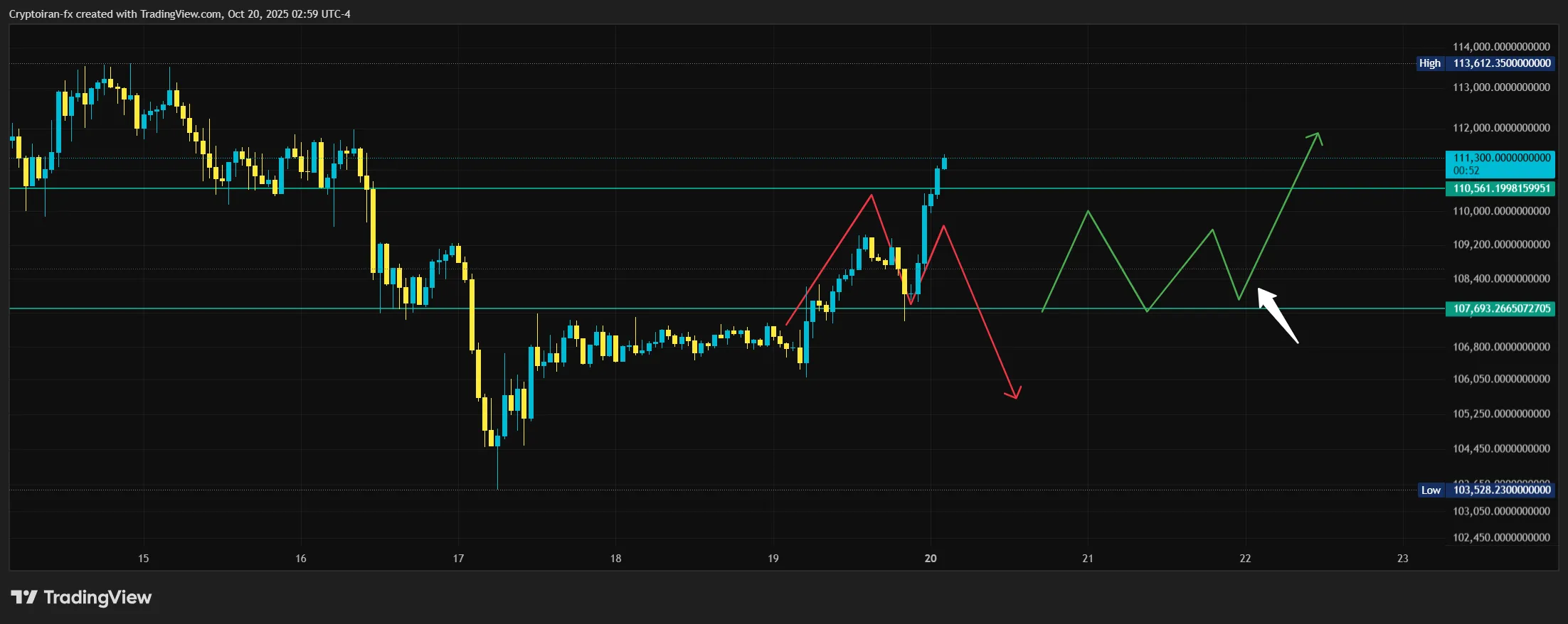 سناریوی دوم برای وقتی که قیمت بالای سطح ۱۰۹ تا ۱۱۰ هزار دلار تثبیت بده، در این صورت میشه با حفظ حمایت ۱۰۷ هزار دلار، وارد پوزیشن خرید شد (فلش سبز). در کل تا زمانی که قیمت زیر مقاومت روانی ۱۱۰ هزار دلاره، احتمال ادامه روند نزولی و رسیدن قیمت به سطح ۱۰۰ هزار دلار بیشتره.