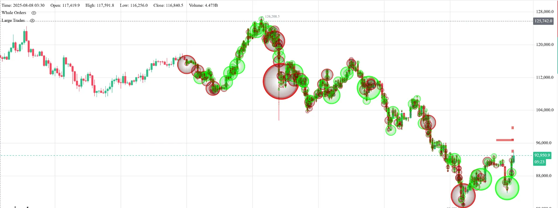 تحلیل رفتار: افزایش ناگهانی حجم معاملات در یک بازار، نشانگر ورود یا خروج نهنگها است. نهنگها اغلب پیش از تحرکات بزرگ بازار فعالیت میکنند و این موضوع در حجم معاملات بازار قابل مشاهده است.