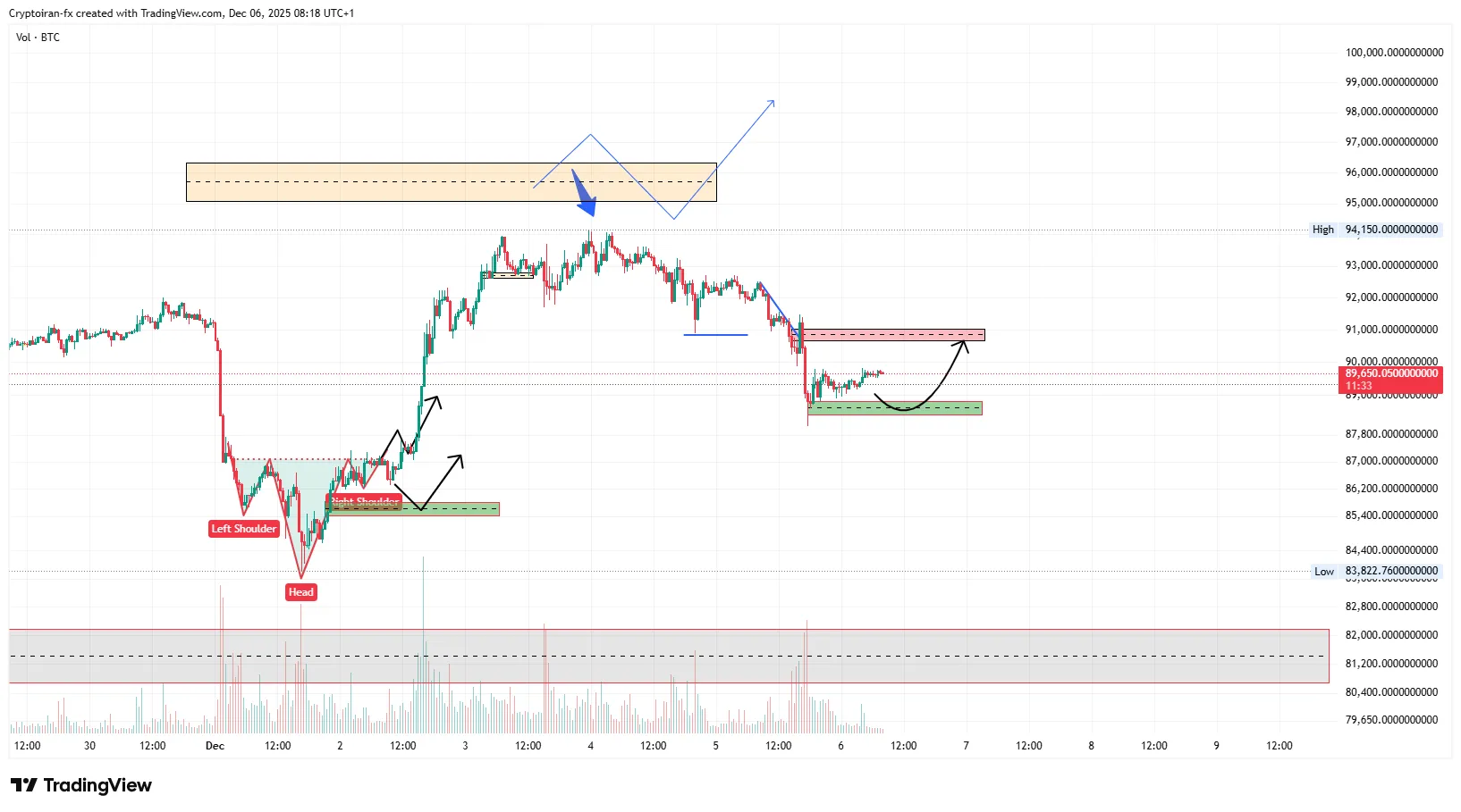 بیت کوین بعد از جمعکردن لیکوییدیتی، یک الگوی سر و شانه معکوس تشکیل داد و تونست خودش رو به سطح عرضه ۸۹ تا ۹۱ هزار دلار نزدیک کنه؛ این ناحیه به عنوان یک مقاومت جدی برای بیت کوین محسوب میشه. درحال حاضر قیمت خودش رو به این محدوده نزدیک کرده و میتونه با رسیدن بهش با فشار فروش کوتاه مدت همراه بشه. روی سطح مشخص شده میتونید با دیدن تاییدیه کندلی و BOS در تایمفریم ۱۵ دقیقهای، وارد پوزیشن فروش بشید. اگه به هر دلیلی هم این سطح پرقدرت رو به بالا شکسته بشه، میتونیم بعد از پولبک با احتمال برد بیشتری وارد موقعیت خرید بیت کوین بشیم. مهمترین شرط برای ادامه روند صعودی و رسیدن به اهداف بالاتر، تثبیت قیمت بالای سطح ۹۲ هزار دلاره.