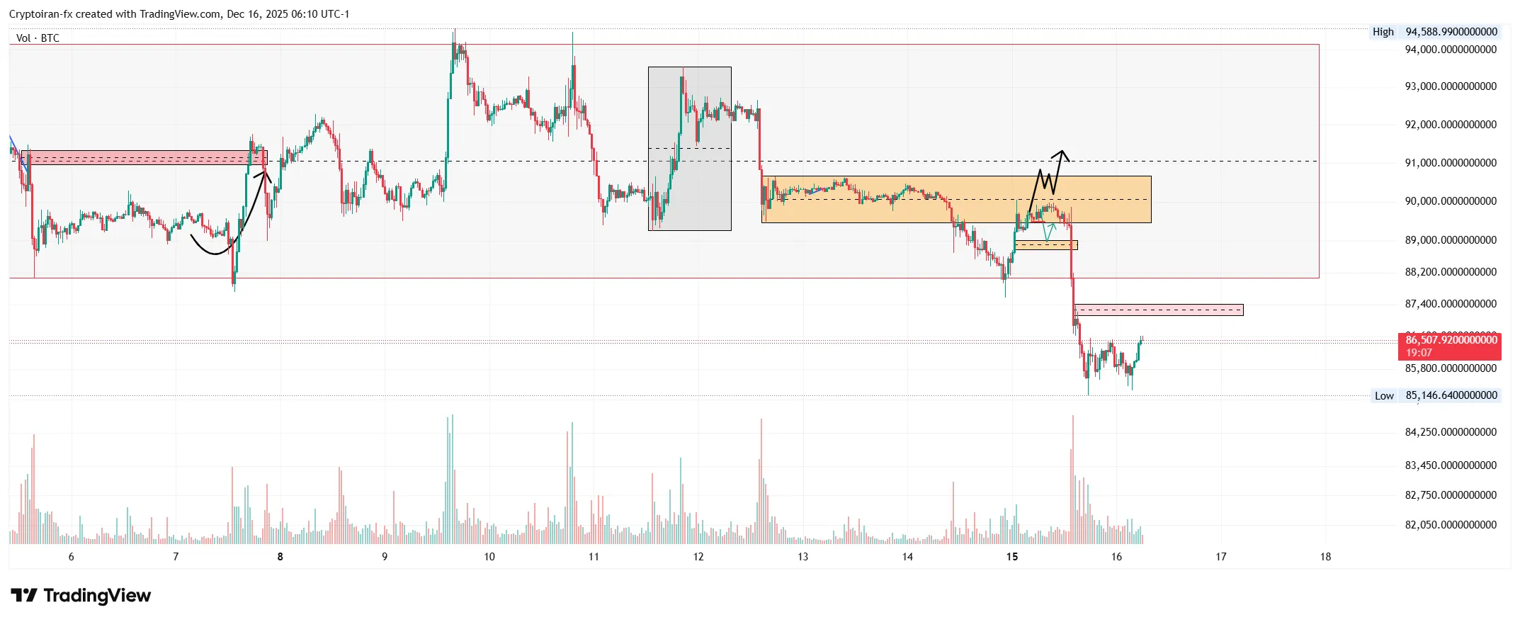 بیت کوین بعد از اینکه حمایت کوتاه مدت ۸۹ هزار دلار رو از دست داد، تا محدوده ۸۵ هزار دلار دراپ سنگینی رو شروع کرد و باعث شد پوزیشنهای لانگ زیادی لیکویید بشه. دلیل این ریزش، ترس از احتمال افزایش نرخ بهره ژاپن در روزهای آینده بود. در حال حاضر سطح ۸۷۰۰۰ تا ۸۷۴۰۰ دلار به عنوان یک مقاومت جدی برای بیت کوین محسوب میشه. اگه قیمت به این محدوده برسه و در تایم فریم پایینتر ساختار نزولی شکل بده، میتونیم با حدضرر ۸۸۳۰۰ دلار وارد موقعیت فروش بیت کوین بشیم. در صورتی هم که این سطح پرقدرت به سمت بالا شکسته بشه و قیمت بالای سطح ۸۸۰۰۰ دلار تثبیت بده، میتونیم به شروع موج c الیوت در قالب روند صعودی خوش بین باشیم. در کل روند بیت کوین در تایم فریم بالاتر نزولیه و باید از نواحی عرضه برای گرفتن پوزیشنهای شورت استفاده کرد.