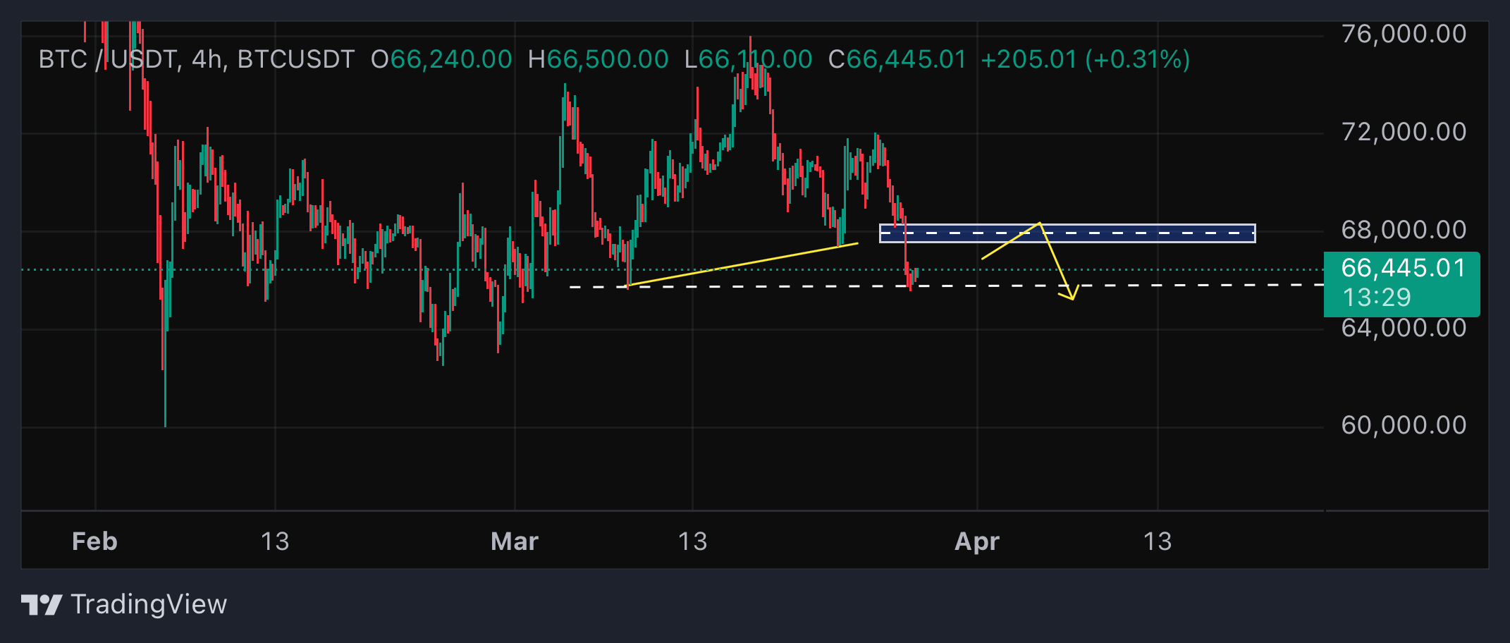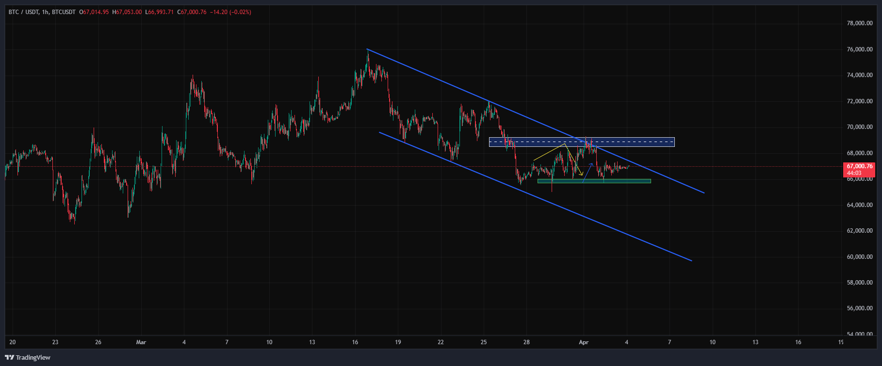 اگه تحلیلهای قبلی رو دیده باشید، به ریزش احتمالی بیت کوین از ناحیه ۶۸ هزار دلار اشاره کرده بودیم.
