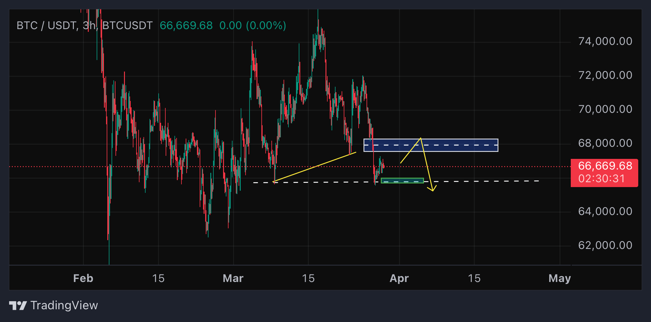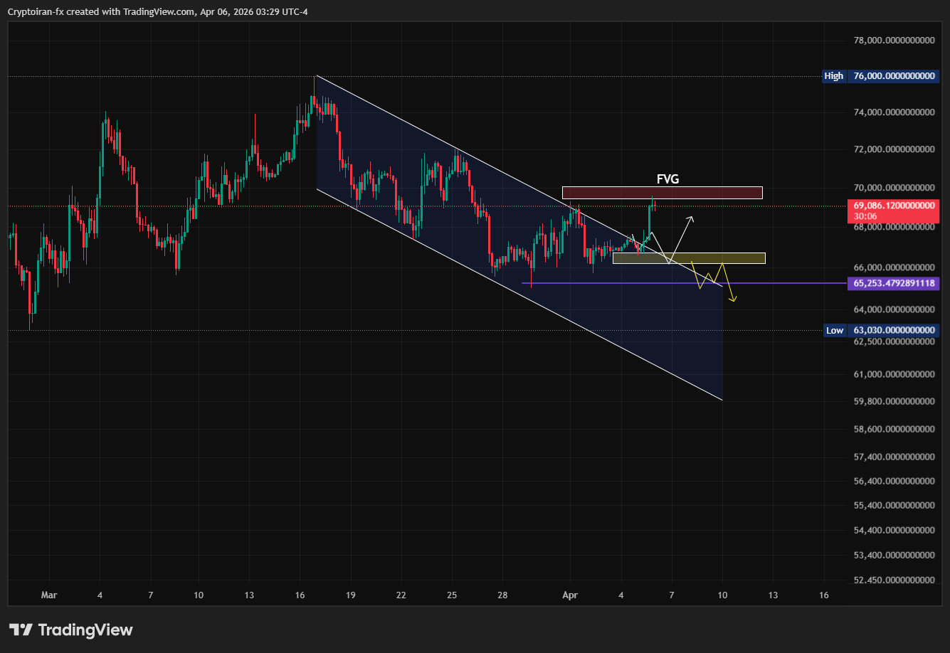 در تحلیلهای قبلی هم به اهمیت ناحیه عرضه ۶۹ هزار دلار اشاره کرده بودم و همونطور که در نمودار مشخصه، قیمت با رسیدن به محدوده مقاومتی، با فشار فروش مواجه شد و حدود ۵ درصد ریزش کرد.