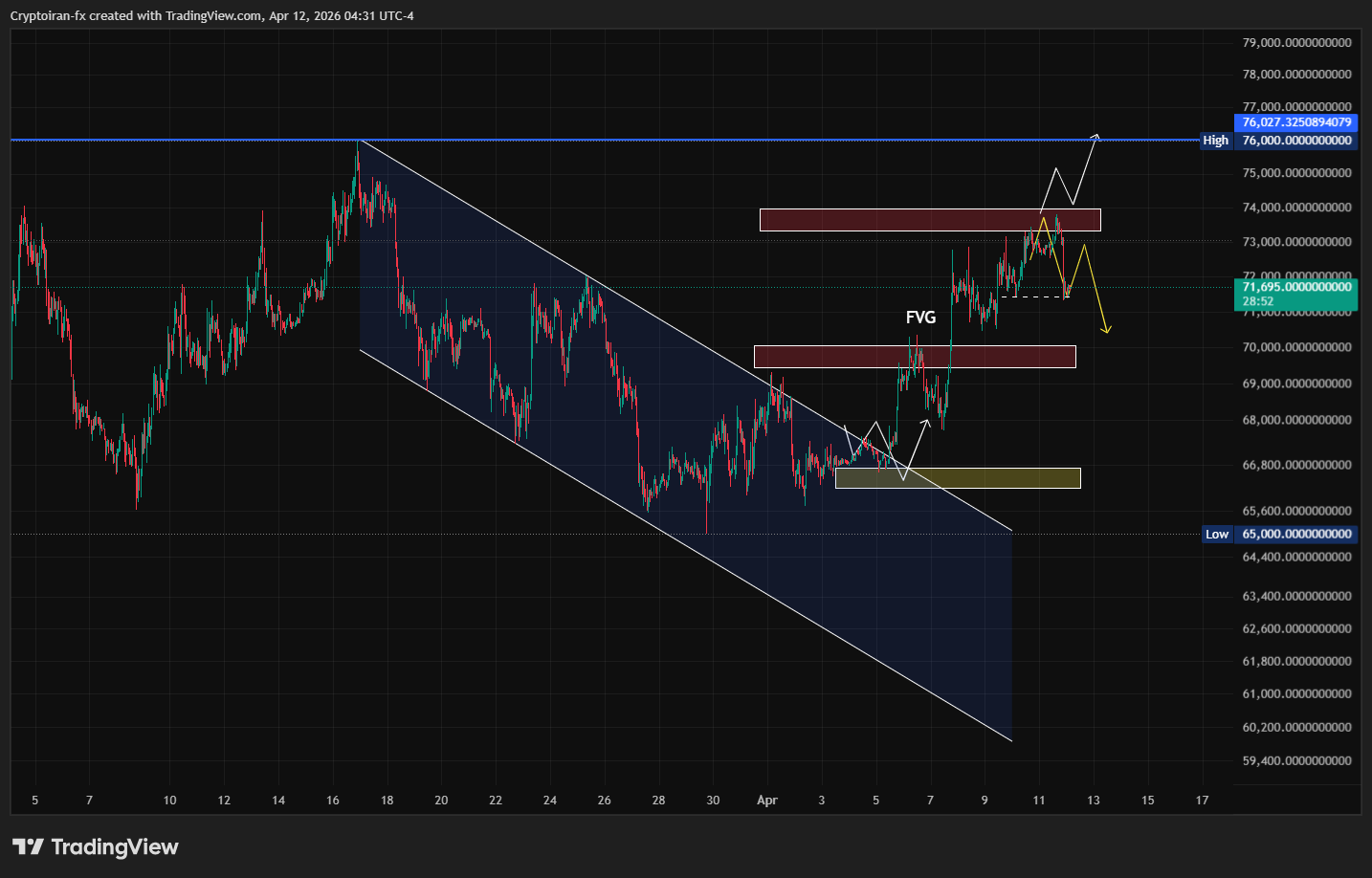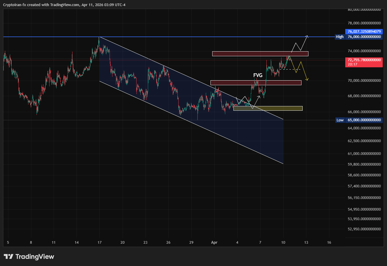 بعد از اعلام آتشبس موقت و پایان درگیریها میان ایران و آمریکا، بازار کریپتو جان تازهای گرفت و بیت کوین موفق شد به کانال ۷۲ هزار دلار برسه. در تحلیل دیروز، به اهمیت حمایت کوتاهمدت ۶۷ تا ۶۸ هزار دلار اشاره کرده بودم و گفتم اگه روی ناحیه مشخصشده تریگر ورود برای موقعیت خرید شکل گرفت، میتونیم وارد پوزیشن لانگ بشیم.