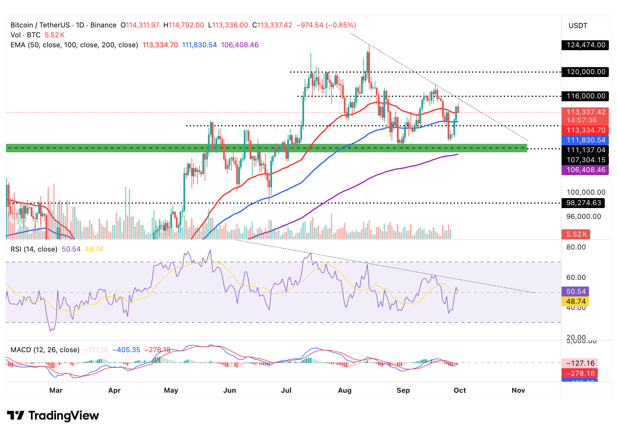 اولین نکته مهم برای تحلیل بیت کوین امروز، حفظ حمایت میانگین متحرک نمایی ۵۰ روزه که الان تقریبا نزدیکه ۱۱۴ هزار دلار هست و فعلا باقی مونده.