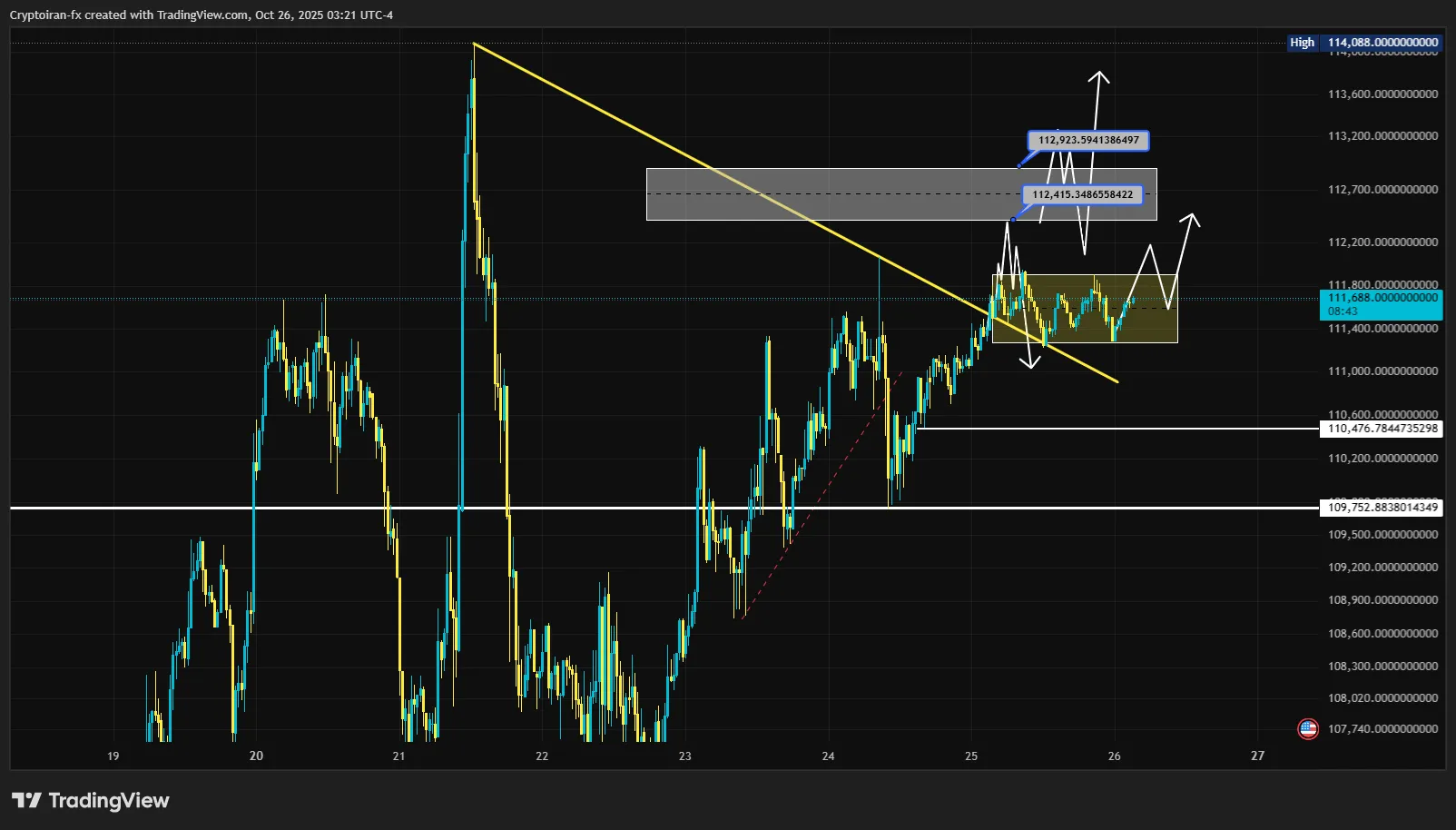 اگه تحلیل هفته پیش بیت کوین رو دیده باشید، هشدار ریزش قیمت از محدوده ۱۱۵ تا ۱۱۶ هزار دلار رو داده بودم که این اتفاق افتاد و پوزیشن فروش بیت کوین فول تارگت شد. در حال حاضر دو سناریوی محتمل وجود داره: سناریوی اول اینه قیمت بین محدوده ۱۰۹۵۰۰ تا ۱۰۶۷۰۰ دلار فشرده بشه و بعد با ساختار نزولی در تایمفریم پایینتر خودش رو به کف ۱۰۳ هزار دلار برسونه.( فلش قرمز)