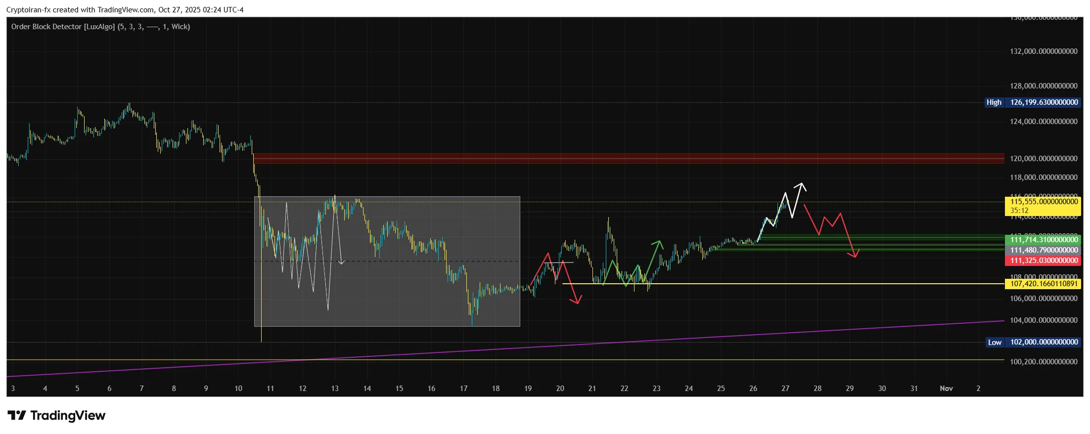 اگه بعد از جمع شدن لیکوییدیتی روی سطح ۱۲۶ هزار دلار، تریگر فروش مثل BOS درتایمفریم پایینتر تشکیل بگیره، میتونیم به فکر پوزیشن فروش بیتکوین باشیم.