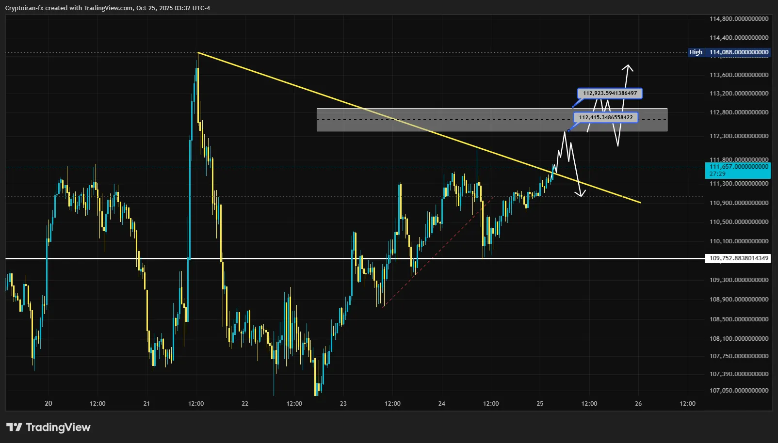 بیت کوین در تایمفریم ۳۰ دقیقهای، تونسته خط روند نزولی خودش رو بشکنه و به مقاومت روانی ۱۱۲ هزار دلار نزدیک بشه. انتظاری که از قیمت دارم اینه که برای جمعکردن نقدینگی تا سطح ۱۱۲۸۰۰ دلار حرکت کنه و از اونجا با فشار فروش مواجه بشه و به هدف ۱۱۰ هزار دلار برسه. سناریوی دوم برای وقتی که قیمت بالای سطح عرضه ۱۱۳ هزار دلار تثبیت بده، در این صورت میشه در پولبک به سطوح پایینتر ( اوردربلاک مصرفنشده) وارد معامله خرید بیت کوین شد.