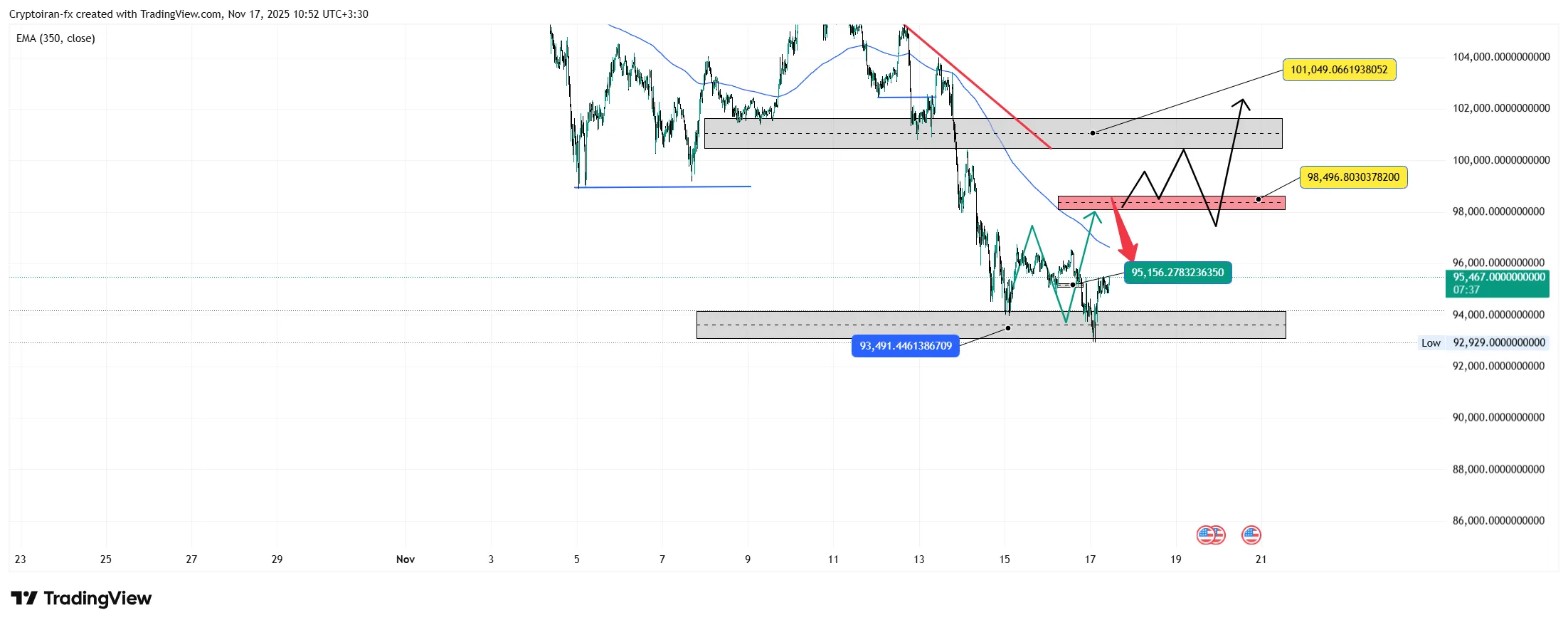 بیت کوین بعد از این‌که سطح حمایتی ۱۰۱ هزار دلار رو از دست داد، تا محدوده ۹۳ هزار دلار ریزش کرد. در حال حاضر قیمت روی یک ناحیه تقاضای مهم قرار داره و می‌تونه به عنوان یک کف خوب برای ارز بیت کوین باشه. اگه سطح  ۹۷۴۰۰ دلار پر قدرت به سمت بالا شکسته بشه یک BOS قوی رخ می‌ده که می‌تونه برای ادامه روند صعودی قیمت مناسب باشه. مهم‌ترین سطح مقاومتی در تایم‌فریم کوتاه مدت ۹۸۳۰۰ تا ۹۸۵۰۰ دلاره. روی سطح ۹۸۵۰۰ دلار می‌شه با دیدن تاییدیه کندلی وارد موقعیت فروش شد. پولبک مجدد قیمت به سطح ۹۳۸۰۰ دلار هم می‌تونه برای پوزیشن خرید بیت کوین مناسب باشه.