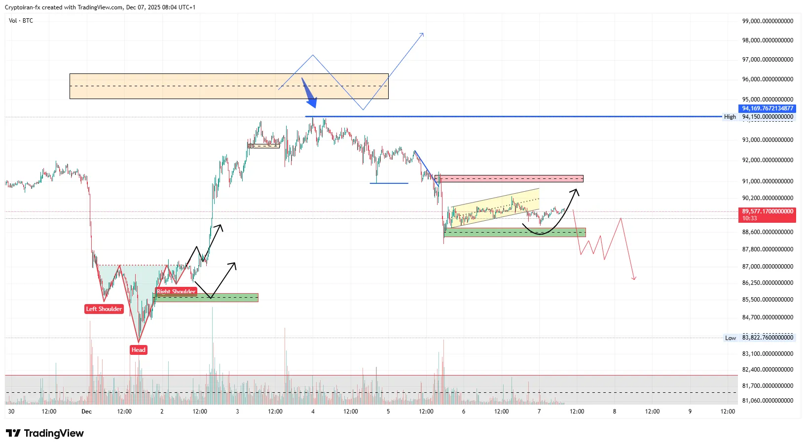 ۲) سناریوی دوم برای موقعی که قیمت بالای این الگو برگرده و روی سطح ۹۸ هزار دلار تثبیت بده؛ در این صورت میتونیم انتظار یک پولبک داخلی و ادامه روند صعودی رو داشته باشیم.