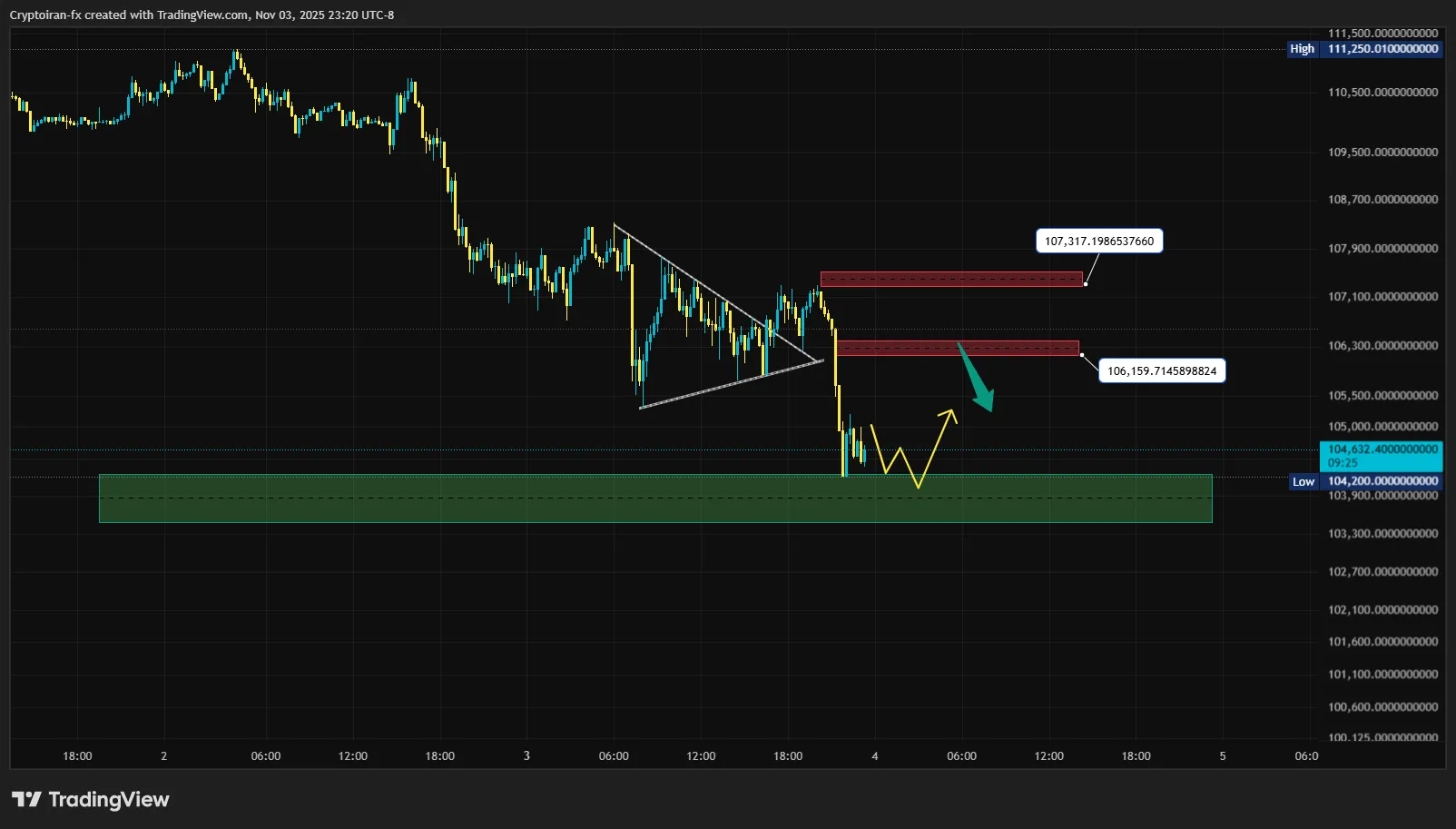 سناریوی دوم برای زمانی که قیمت سطح حمایتی ۱۰۶ هزار دلار رو از دست بده و زیر محدوده ۱۰۶ هزار دلار کلوز ۴ ساعته بده؛ در این صورت میتونیم بعد از تکمیل پولبک دو مرحلهای و دیدن تاییدیه کندلی وارد موقعیت فروش بیت کوین بشیم. در صورت ادامه روند نزولی، اولین هدف قیمت ۱۰۵ و بعد ۱۰۲ هزار دلاره.