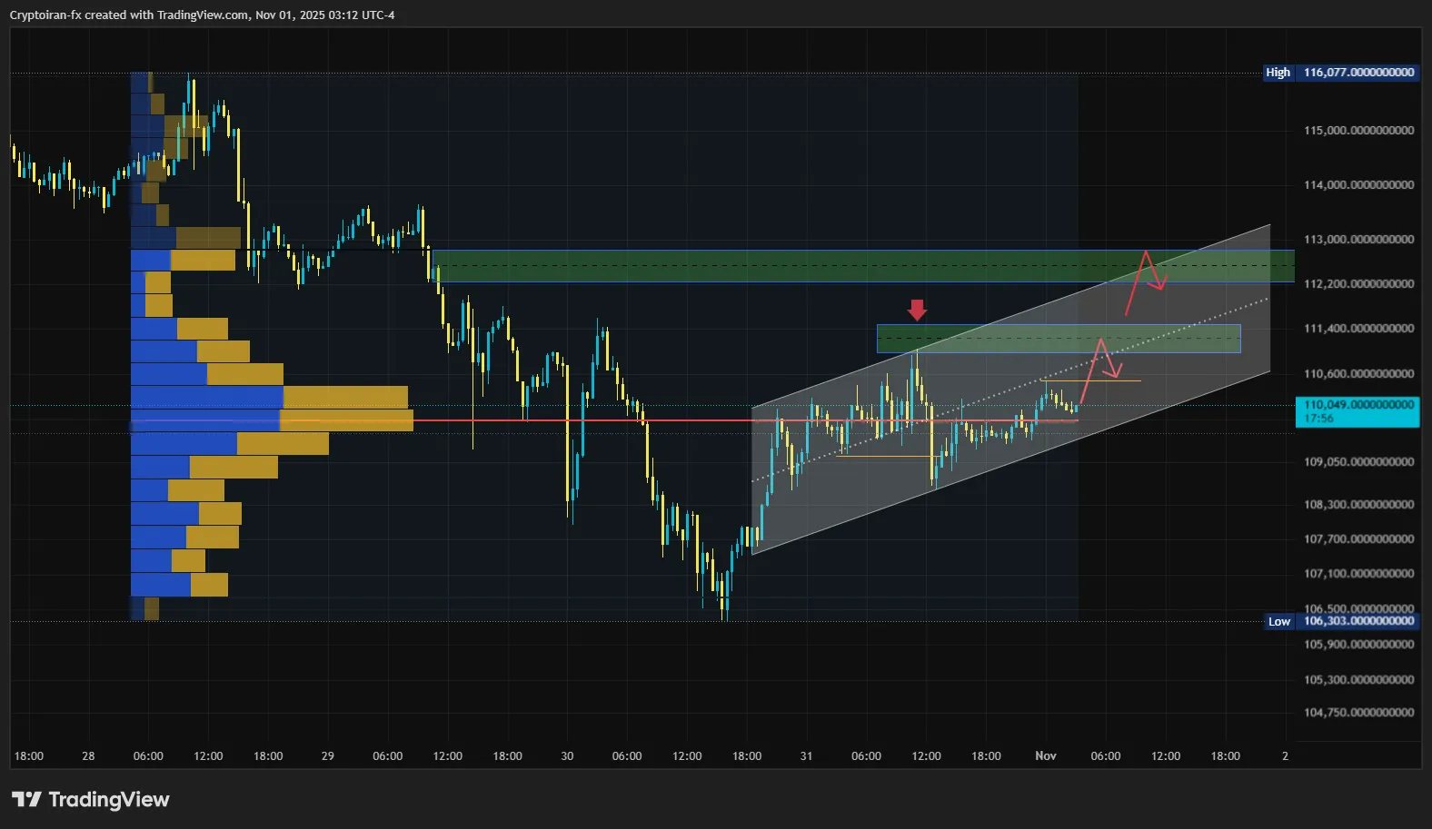 بیت کوین در تایمفریم ۳۰ دقیقهای، داخل یک کانال صعودی قرار گرفته و بر اساس دیتای حجم، بالای سطح حمایتی ۱۰۹۰۰۰ دلار معامله میشه. در حالحاضر دو ناحیه مهم عرضه وجود داره که به ترتیب سطح ۱۱۱۵۰۰ و ۱۱۲۶۰۰ دلاره. تا زمانی که قیمت زیر این نواحی قرار داره، روند نزولیه و هر اصلاحی به عنوان پولبک برای ادامه ریزش تلقی میشه. اگه کف کانال صعودی پرقدرت شکسته بشه، قیمت میتونه به سطح ۱۰۸ هزار دلار برگرده. روی سطوح مشخصشده میتونین با دیدن تاییدیه ساختاری، مثل BOS وارد پوزیشن فروش بیت کوین بشید.