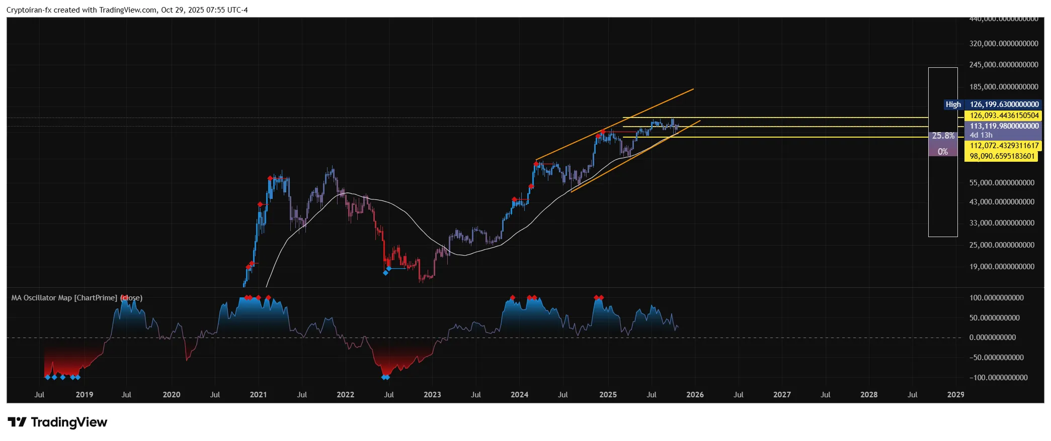 بیت کوین روی نمودار هفتگی در یک فاز اصلاحی قرار داره و بعد از لمسکردن خط مقاومت بالای الگوی کنج، حالا دچار کاهش قیمت شده که پیشبینی میشه اگر توی این مسیر ۱۱۰ هزار دلار از دست بره، تا ناحیه بین ۱۰۳ و ۱۰۰ هزار دلار اصلاح خواهیم داشت. این محدوده حمایتی با میانگین متحرک نمایی ۵۰ هفتهای (بسیار مهم) و خط فیبوناچی ۱.۶۱۸ تلاقی داره و به یک هدف تکنیکال و همچنین نقطه بازگشت مهمی تبدیل شده. هیچ پوزیشنی بدون گرفتن تاییدیه از سطوح معرفیشده باز نکنید.