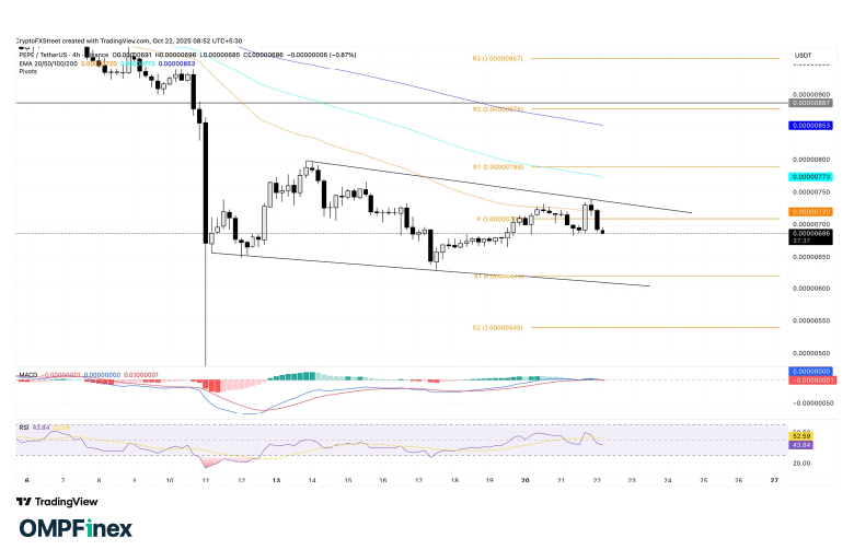 پپه نیز روز سهشنبه ۳٪ افت کرد و فاز اصلاحی را از سر گرفت. این میم کوین در حال حاضر زیر سطح ۰/۰۰۰۰۰۷ دلار قرار دارد و سطح حمایتی ۰/۰۰۰۰۰۶۱۹ دلار را هدف گرفته است. همانند سایر میم کوینهای شاخص، اندیکاتورها نشاندهنده کاهش فشار خرید و احتمال نزولی بودن روند هستند.