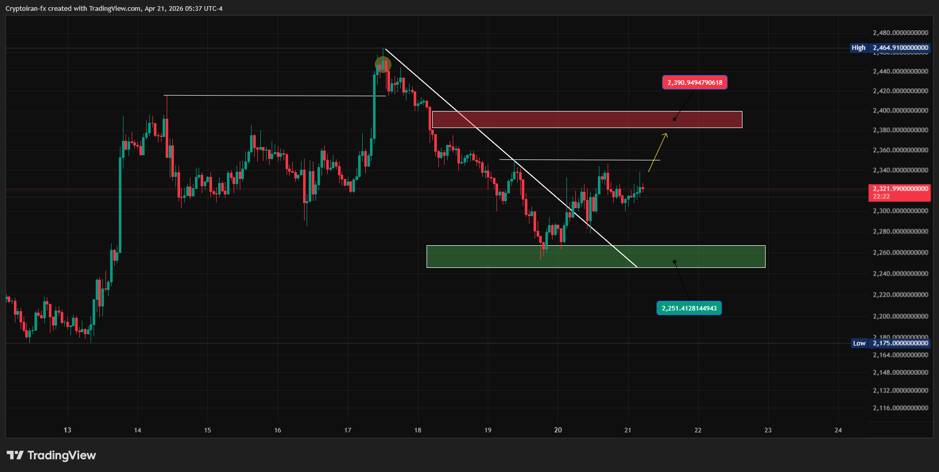 اتریوم بعد از یک اصلاح نسبتا عمیق، از محدوده تقاضای ۲۲۵۰ دلار واکنش نشون داده و فعلا تونسته خودش رو بالای این ناحیه حفظ کنه. شکست خط روند نزولی کوتاهمدت هم نشون میده که فشار فروش نسبت به قبل کمتر شده، ولی هنوز بازار وارد فاز صعودی قدرتمند نشده و بین دو ناحیه مهم در حال نوسانه.