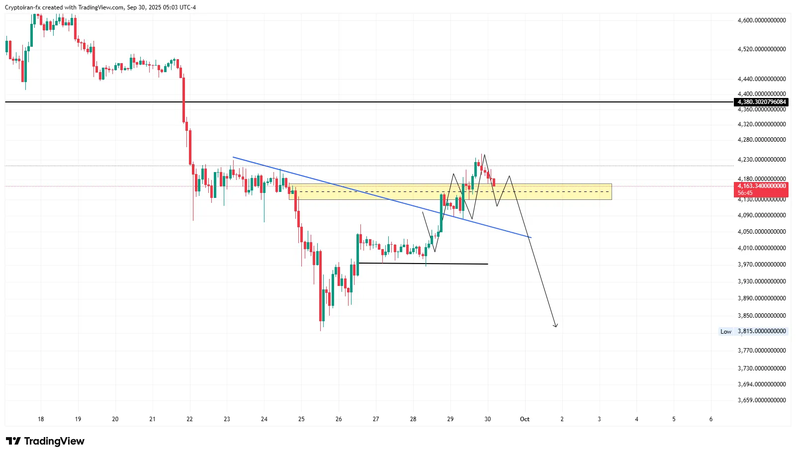تو تایمفریم ۲ساعته، اتریوم خط روند نزولی خودش رو شکسته و الان روی ناحیه پولبک ۴۱۳۰–۴۱۸۰ معامله میشه. تا وقتی بالای این محدوده تثبیت نداشته باشیم، نوسانهای قیمت زیاد و احتمال فیکاوت بیشتره.