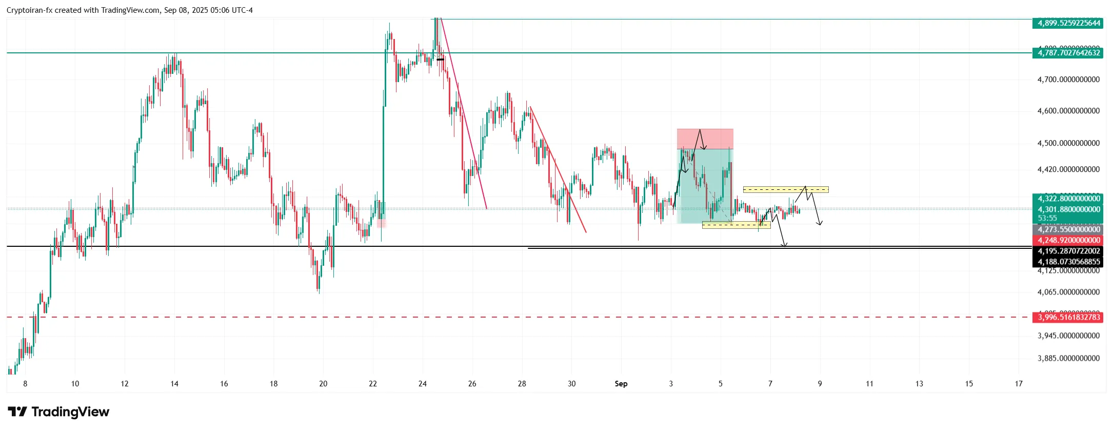 تحلیل اتریوم: ناحیه عرضه ۴۳۵۰-۴۴۰۰ دلار و فرصت معامله فروش