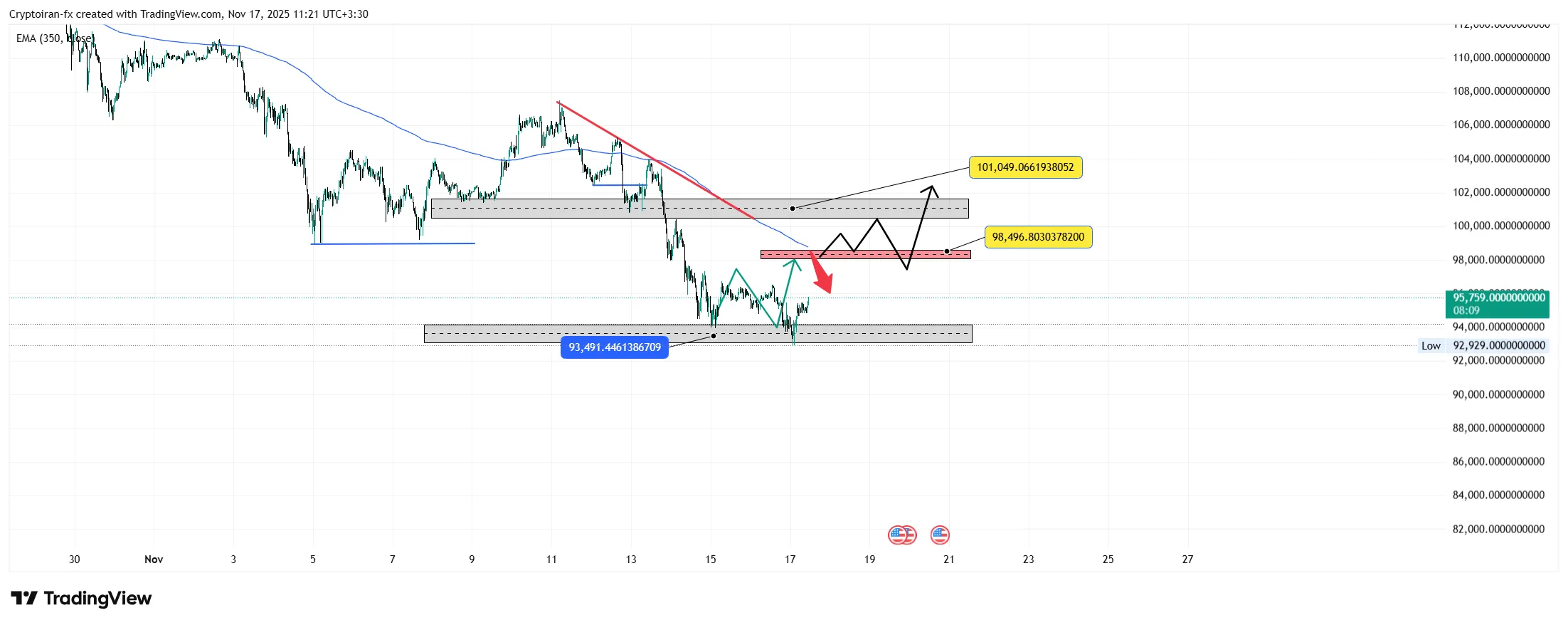 بیت کوین بعد از دست دادن حمایت کوتاهمدت خودش، کف ۹۳ هزار دلار رو تست کرد و با فشار فروش مواجه شد. کندل هفتگی نشوندهنده فشار فروش بالاست و اگه این هفته قیمت بیت کوین نتونه مقاومتهای ۹۵,۶۰۰ و ۹۸,۴۰۰ دلاری رو پشت سر بذاره، ادامه روند نزولی محتمله. با این حال، جمع شدن نقدینگی در کف اصلی میتونه باعث بازگشت روند صعودی بشه. عبور از نواحی عرضه کلیدی، چشمانداز صعودی رو تقویت میکنه.