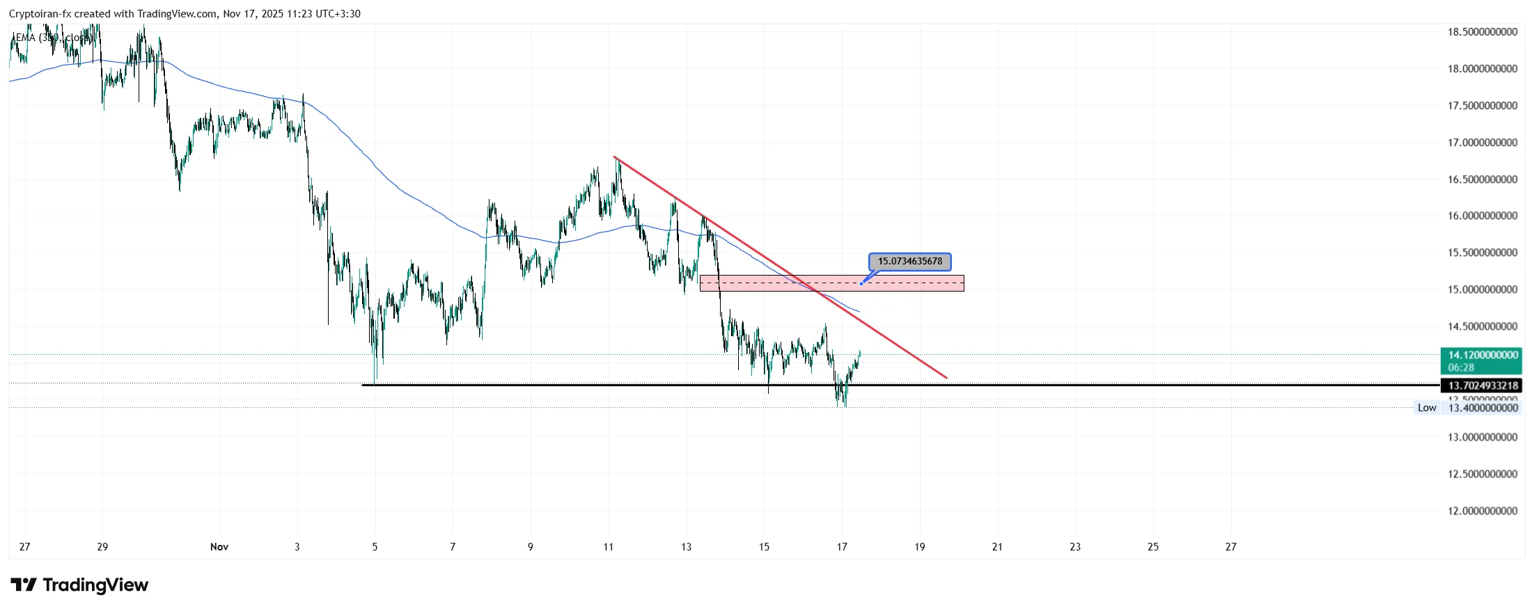 چینلینک بعد از اصلاح بیت کوین به سطح ۱۳ دلار رسید، جایی که در گذشته پامپهای خوبی شروع شده. اولین مقاومت کوتاهمدت ۱۴.۵ دلاره و در صورت عبور، قیمت میتونه تا ۱۵ دلار و حتی خط مووینگ اوریج خودش حرکت کنه. شکست خط روند نزولی در تایمفریم یک ساعته هم میتونه روند صعودی جدید رو تقویت کنه.