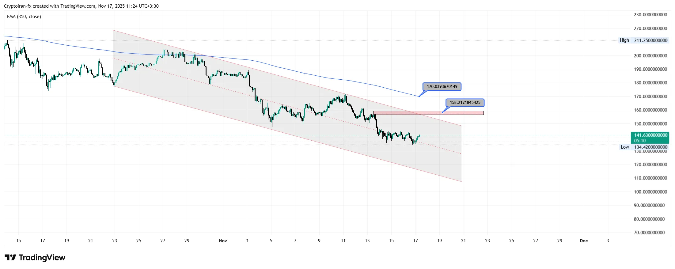 سولانا در هفته اخیر نسبت به بیت کوین و اتریوم جریان ورودی خوبی از نهادها داشته و توجه خریداران رو جلب کرده. قیمت در کانال نزولی بلندمدت قرار داره و مجدد بالای میدلاین برگشته. اگر مومنتوم خرید بالا بره و مقاومت کوتاهمدت ۱۴۴ دلار شکسته بشه، میتونیم به سقف کانال و مووینگ اوریج اصلی توجه کنیم.