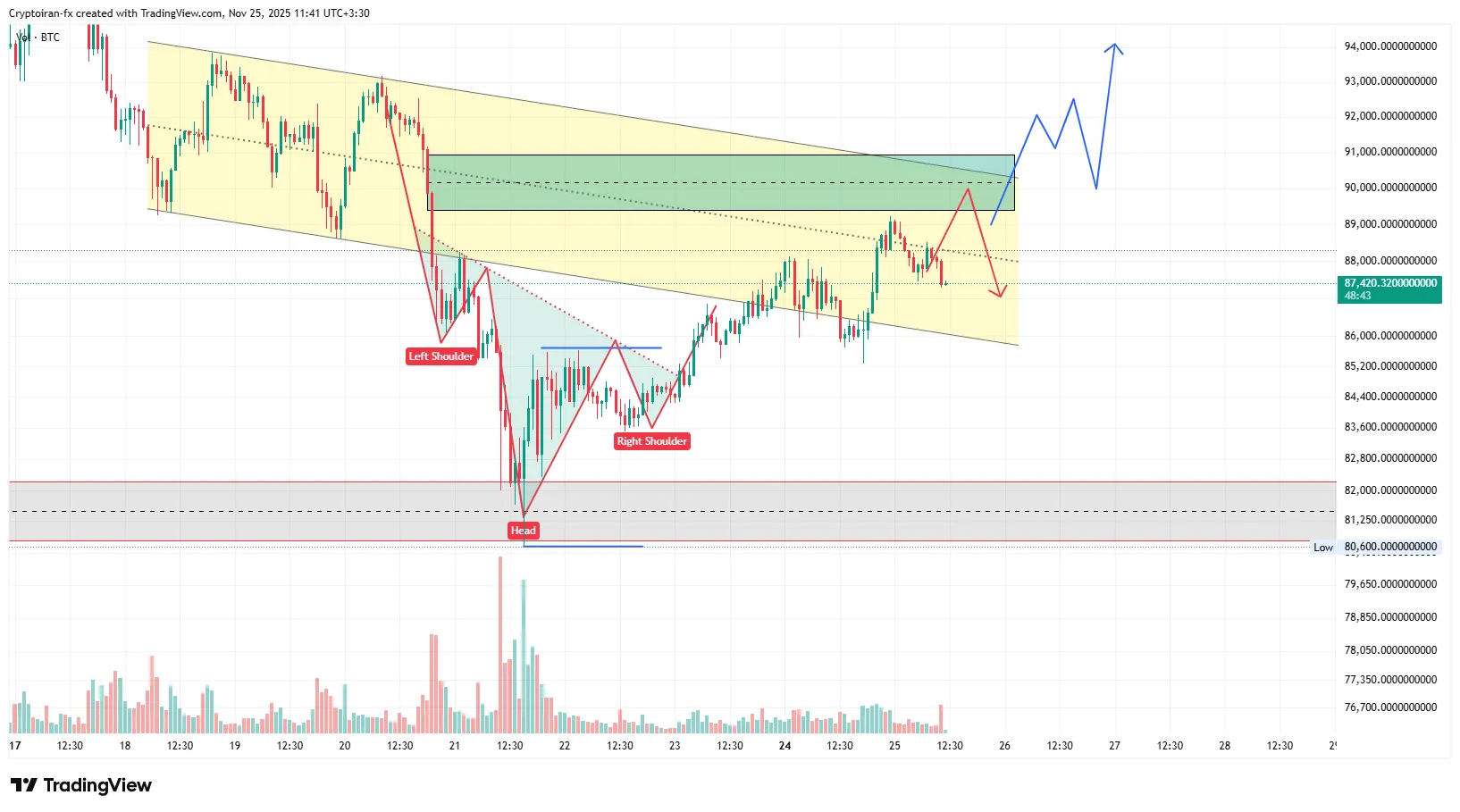 بیتکوین پس از رسیدن به سطح ۸۰,۰۰۰ دلار با مومنتوم صعودی همراه شد و الگوی سر و شانه معکوس تشکیل داد. حالا قیمت به ناحیه ۸۹ تا ۹۱ هزار دلار رسیده که یک مقاومت روانی مهم محسوب میشه. اگه بیتکوین بتونه خودش رو به این سطح برسونه و با فشار فروش زیادی مواجه نشه، احتمال شروع موج C الیوت و ادامه روند صعودی وجود داره. عبور بیتکوین از این محدوده میتونه برای رشد آلتکوینها موثر باشد.