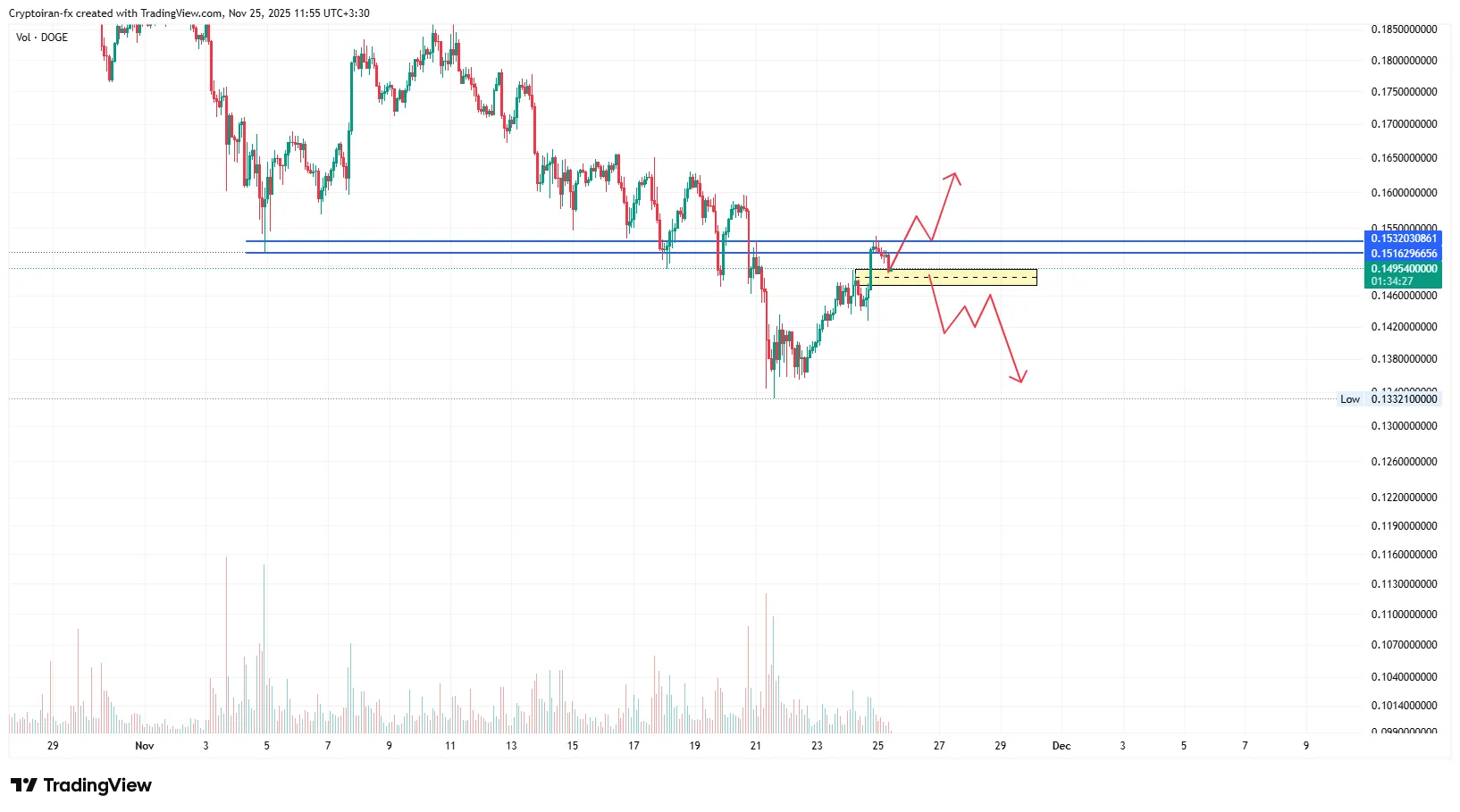 دوج کوین در تایمفریم ۲ ساعته نقدینگی زیادی جمع کرده و خودش رو به سطح شکسته شده نزدیک کرده. اگه قیمت بتونه بالای ۰.۱۵۳ دلار تثبیت بشه، ادامه روند صعودی محتمله. مهمترین سطح حمایتی کوتاهمدت ۰.۱۴۸ دلاره؛ تا زمانی که این حمایت پابرجا باشه، میشه به شکسته شدن مقاومت ۰.۱۵ دلار امیدوار بود. نمودار دوج کوین نسبت به بیتکوین هم در نقطه مهمی قرار داره و میتونه برای پامپ احتمالی موثر باشه.