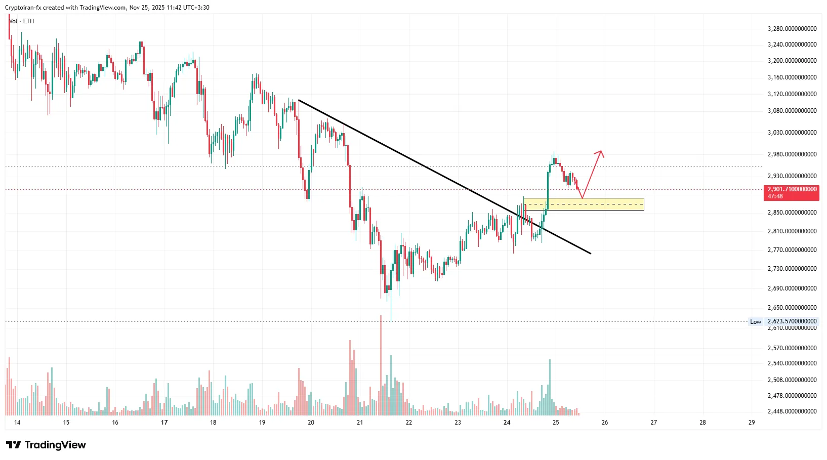 اتریوم حمایت ۲,۸۰۰ دلار رو حفظ کرده و در تایمفریم ۱ ساعته موفق شده خط روند نزولی خودش رو بشکنه و سقف بالاتر ایجاد کنه. حمایت ۲,۸۰۰ تا ۲,۸۶۰ دلار میتونه عامل محرک ادامه روند صعودی باشه. اگه بیتکوین به سطح ۹۱ هزار دلار برسه و از آن عبور کنه، اتریوم هم میتونه مقاومت روانی ۳,۰۰۰ دلار رو پشت سر بذاره و به ناحیه ۳,۲۰۰ دلار برسه. حفظ حمایت ۲,۸۰۰ دلار برای ادامه روند صعودی الزامیه.