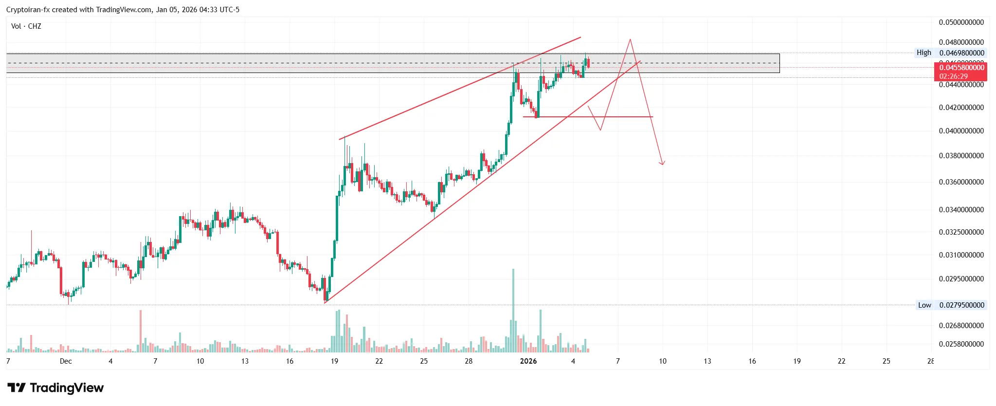ارز چیلیز یکی از بهترین پروژهها در حوزه ورزش و فن توکنهاست. این ارز اخیرا روند صعودی خوبی رو شروع کرده و تونسته به مقاومت ۰.۰۴۷ دلار برسه. عبور قیمت از این سطح میتونه برای چیلیز اتفاقی مثبت باشه. در تایم فریم ۴ ساعته یک الگوی وج صعودی تشکیل شده که قیمت میتونه به سقف و کف این الگو برسه و واکنش نشون بده. اگه کف ۰.۰۴۱ دلار از دست بره، میتونیم در پولبک به سطوح بالاتر وارد موقعیت شورت بشیم. عبور قیمت از ناحیه عرضه مشخص شده هم میتونه به ادامه روند صعودی کمک کنه.