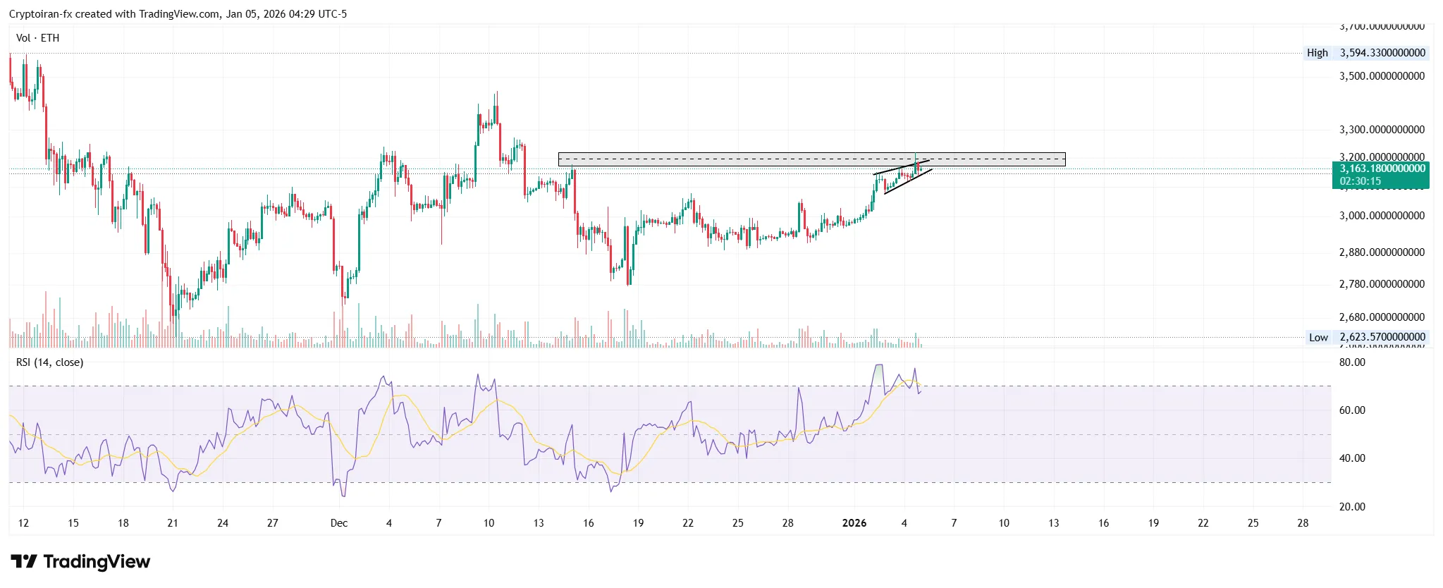 اتریوم مثل بیت کوین موفق شد با رفتار صعودی هولدرهای خودش رو سورپرایز کنه و به سطح ۳۲۰۰ دلار برسه. در حال حاضر قیمت اتریوم با یک الگوی وج زیر سطح عرضه ۳۲۲۰ دلار نوسان میکنه. همچنین در این تایم فریم واگرایی منفی تشکیل شده و تا وقتی که اتریوم نتونه بالای سطح ۳۳۰۰ دلار تثبیت بده، میتونیم انتظار ریزش قیمت رو داشته باشیم. مهم ترین حمایت کوتاه مدت ۳۰۸۰ تا ۳۱۰۰ دلاره، حفظ این محدوده میتونه برای ادامه روند صعودی اتریوم مفید باشه.