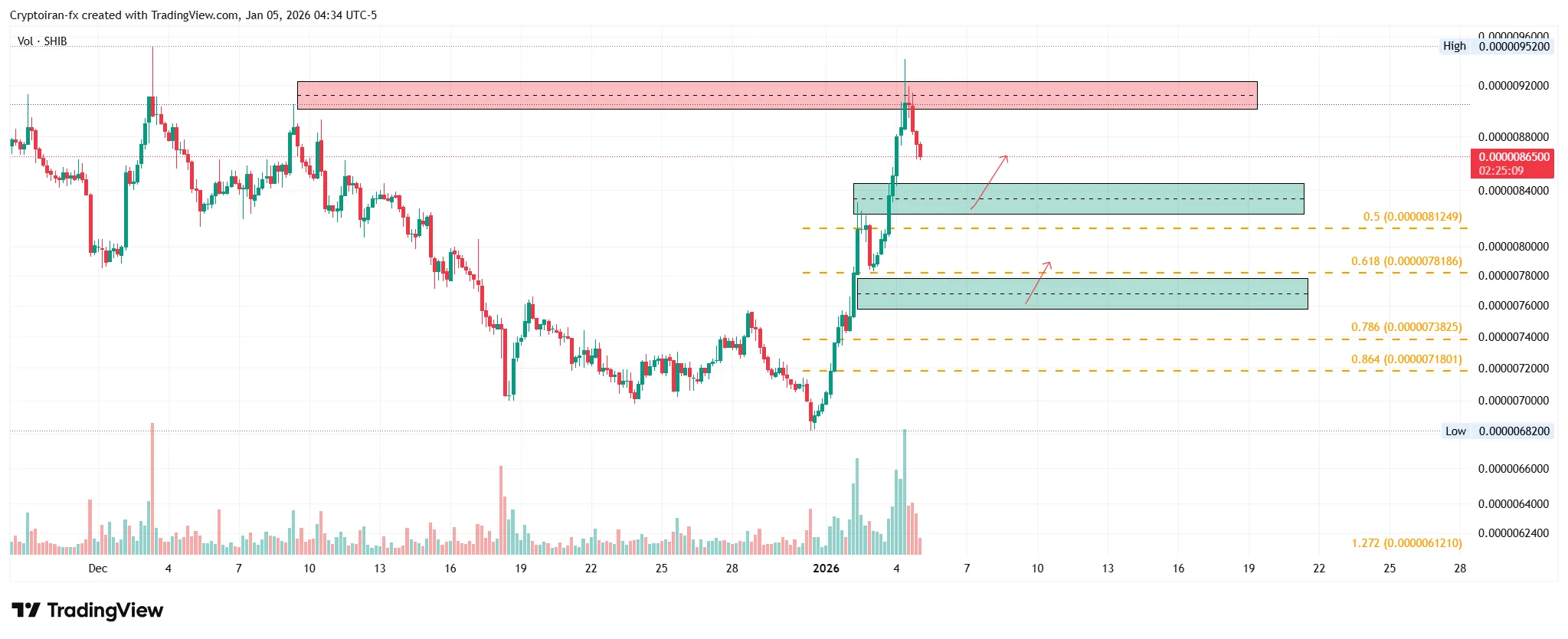 میم کوین شیبا اخیرا موفق شده با رالی قوی، خودش رو به سطح عرضه ۰.۰۰۰۰۰۹۴ دلار برسونه و نقدینگی بزرگی رو جمع کنه. طبق لولهای فیبوناچی، دو prz مهم سر راه قیمت وجود داره که میتونید با دیدن تاییدیه ورود روی این نواحی اقدام به خرید شیبا کنید. اگه این سطوح از دست بره، میتونیم در پولبک به همین نواحی وارد موقعیت فروش بشیم.