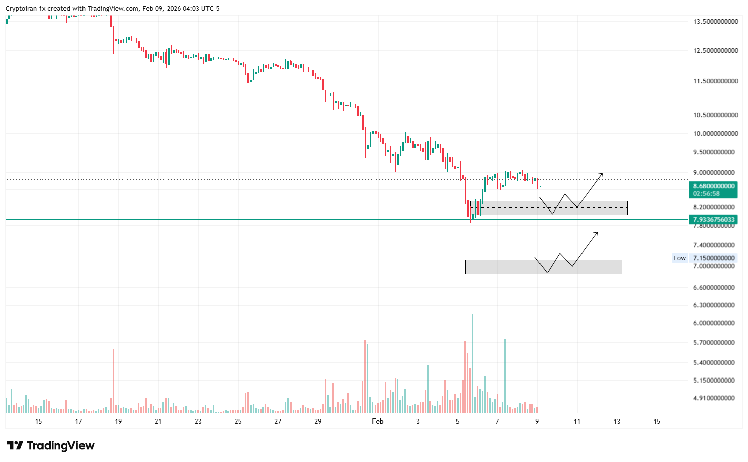 اولین ناحیه بین ۷.۹ تا ۸.۲ دلار قرار داره و ناحیه دوم محدوده ۶.۸۴ تا ۷.۰۵ دلاره. چین لینک این هفته حتما باید در واچ لیست شما باشه چون در صورت شروع حرکت صعودی بیت کوین، پتانسیل رشد قابل توجهی داره.