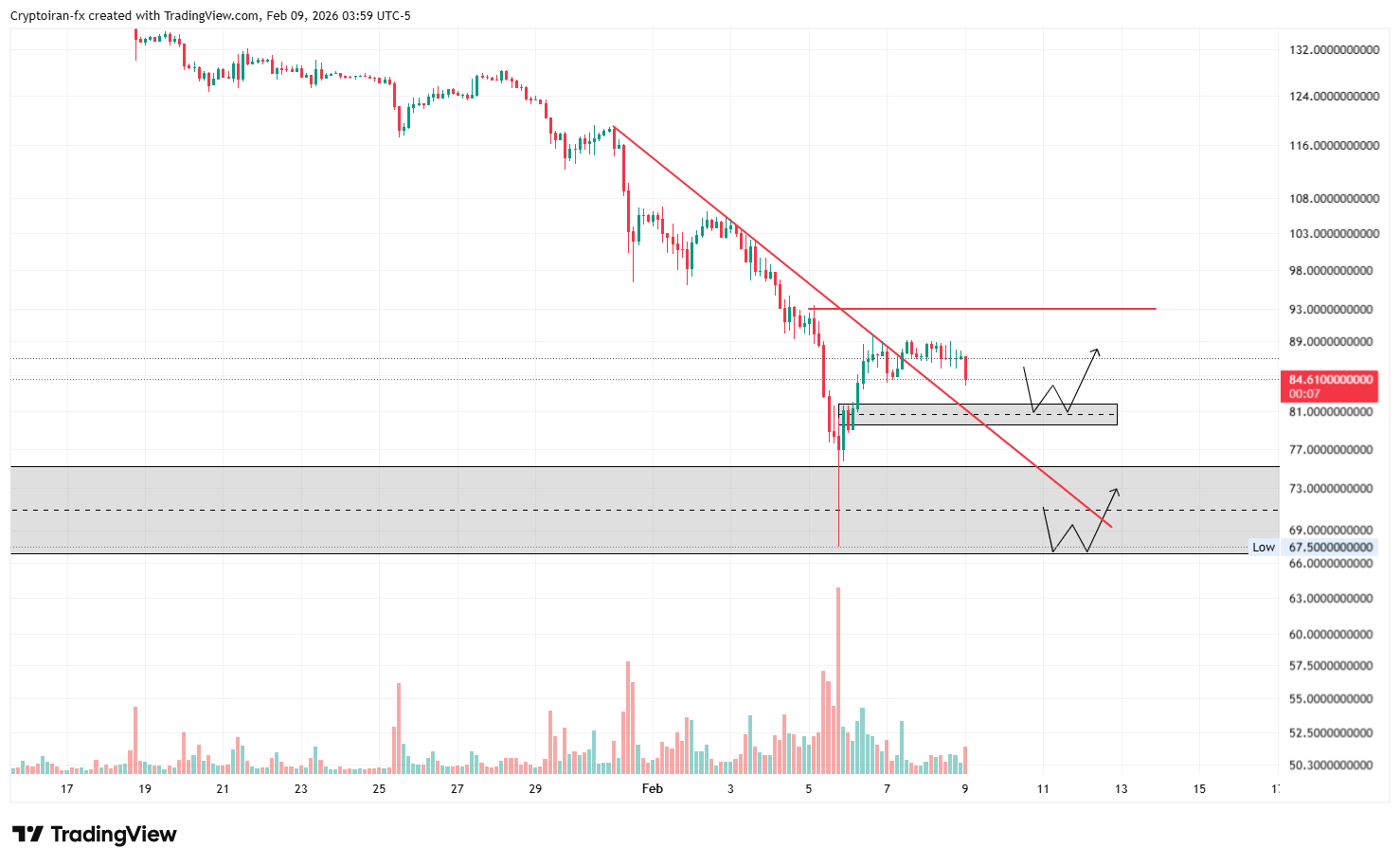 سولانا بیش از ۷۰ درصد از سقف تاریخی خودش اصلاح کرده و به محدوده تاریخی ۷۰ دلار رسیده. در حال حاضر مهمترین حمایت قیمت بین ۶۷ تا ۷۲ دلاره. علاوه بر این، ناحیه ۸۰ تا ۸۲ دلار هم یک سطح کلیدی برای تصمیمگیری محسوب میشه. اگه روی این محدودهها ساختار صعودی مثل BOS شکل بگیره، میتونیم انتظار رشد قیمت سولانا رو داشته باشیم. با این حال تا زمانی که قیمت زیر سطح ۹۳ دلار قرار داره، روند کلی نزولیه و هر حرکت صعودی میتونه صرفا یک پولبک برای ادامه ریزش در نظر گرفته بشه.