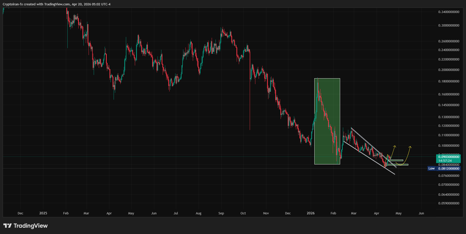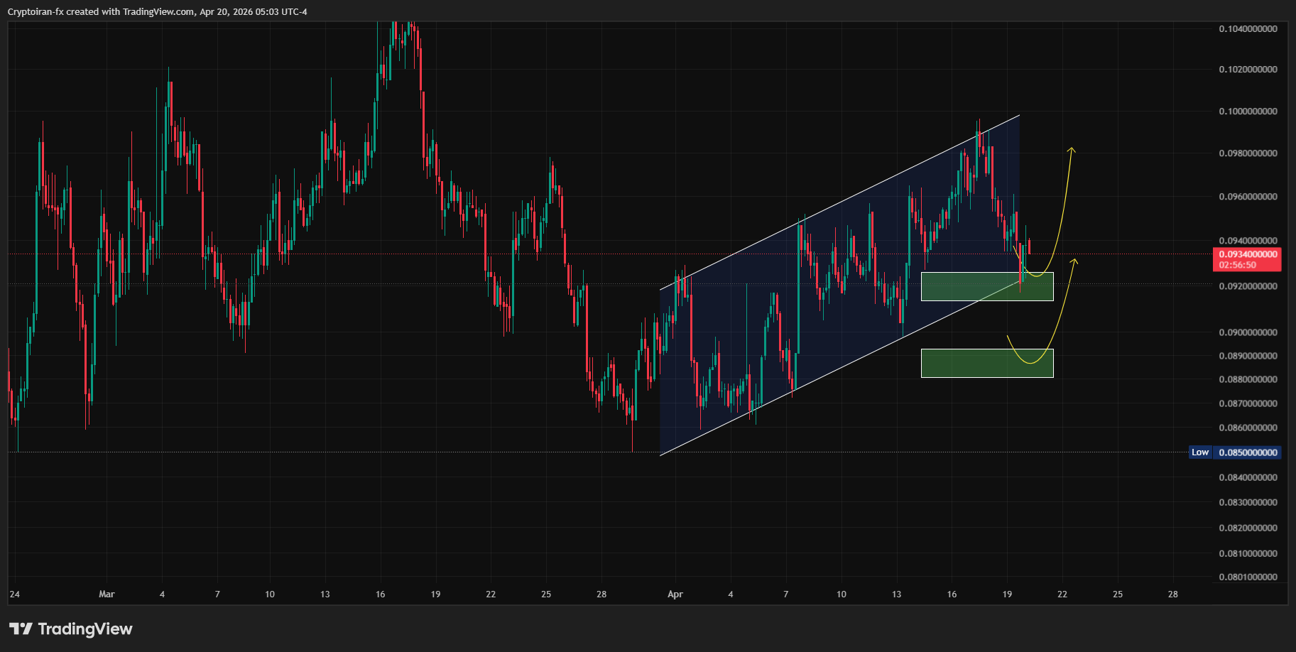 حمایت اولیه در محدوده ۰.۰۸۸ دلار و حمایت مهمتر در ۰.۰۸۴ دلار قرار داره. در تایم فریمهای پایینتر، با دیدن تاییدیه مناسب میشه به فکر ورود تا اهداف بالای ۰.۱ دلار بود.