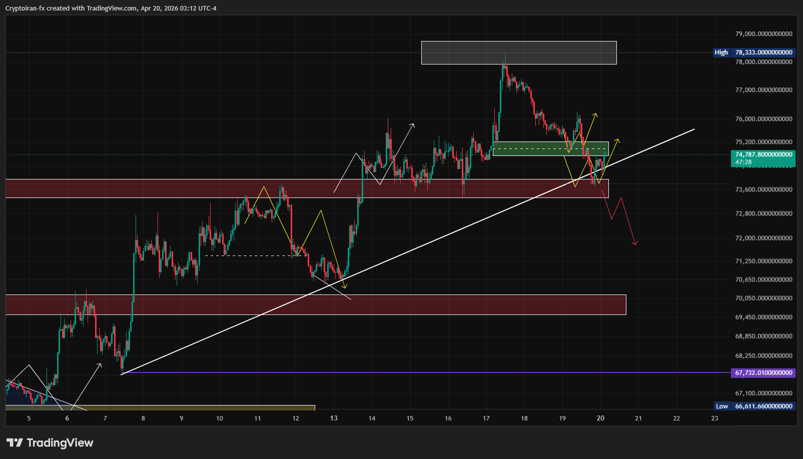 درحالحاضر، سطح ۷۴ هزار دلار بهعنوان حمایت کلیدی محسوب میشه و تا زمانیکه قیمت بالای این ناحیه باقی بمونه، سناریوی صعودی همچنان معتبره. در اینصورت، اهداف بعدی میتونن محدوده ۷۶ هزار و بعد ۷۸ هزار دلار باشن.