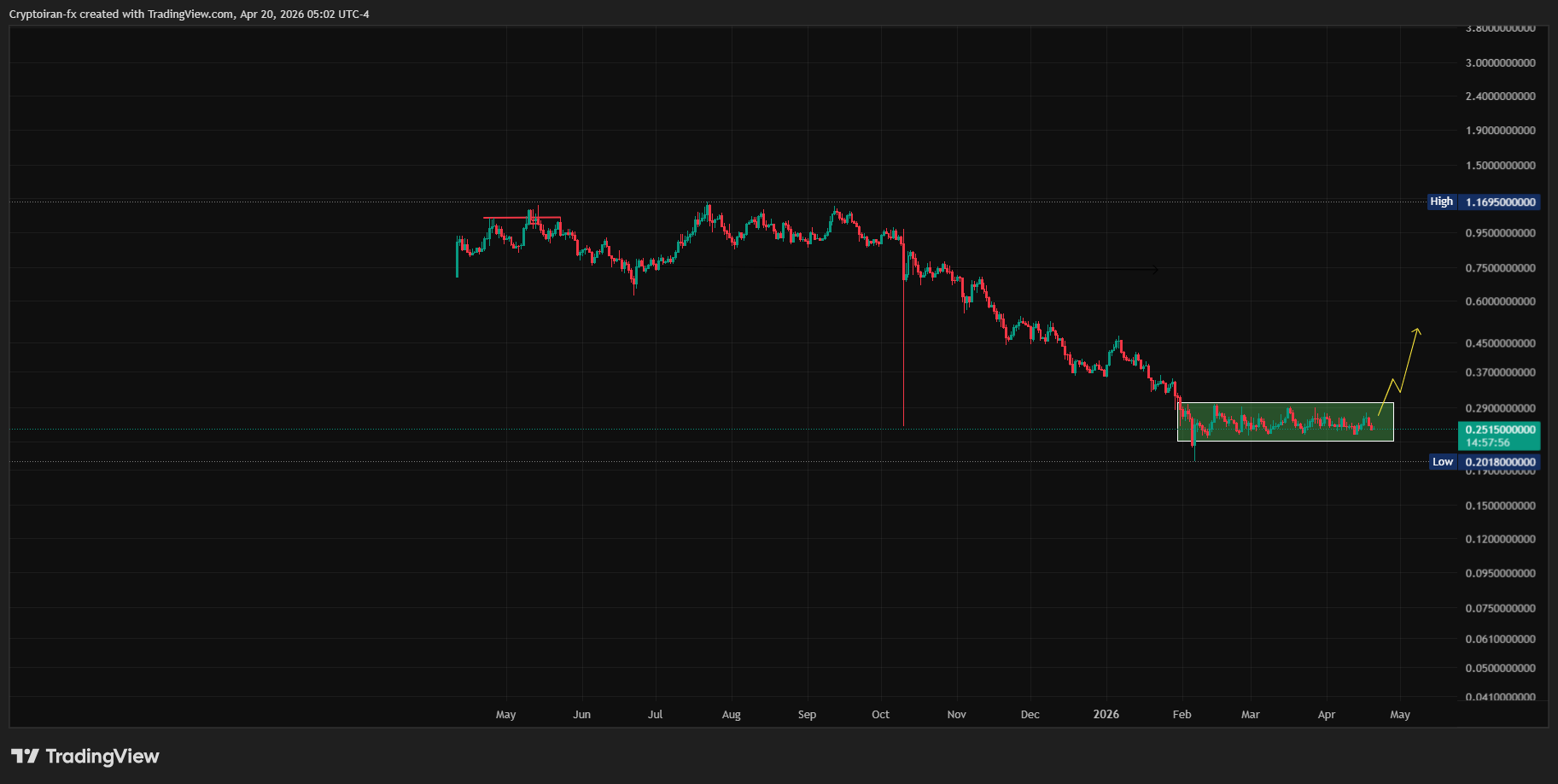 این نوع فشردگی معمولا قبل از یک حرکت قدرتمند اتفاق میافته. در صورت شکست سقف رنج، میتونیم انتظار رشد تا محدودههای ۰.۳ و بعد ۰.۴ دلار رو داشته باشیم.