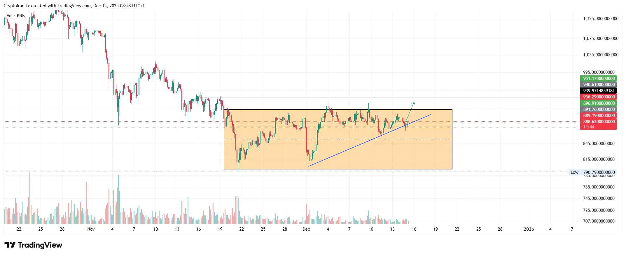 ارز بایننس کوین از قدیم تا به الان نسبت به آلت کوینهای دیگه رشد بیشتری داشته و در اصلاحات کمتر ریخته؛ چرا که صرافی بایننس همیشه پشت این ارز بوده. در حال حاضر قیمت در یک فاز رنج طولانی قرار گرفته و حمایت ۸۴۰ دلار به خوبی حفظ شده. اگه قیمت بتونه بالای سقف رنج خودش تثبیت بده و مجدد زیر این سطح برنگرده، میتونیم به رسیدن قیمت به اهداف ۹۳۰ و بعد ۹۵۰ دلار خوش بین باشیم. ارز BNB رو این هفته حتما زیر نظر بگیرید.