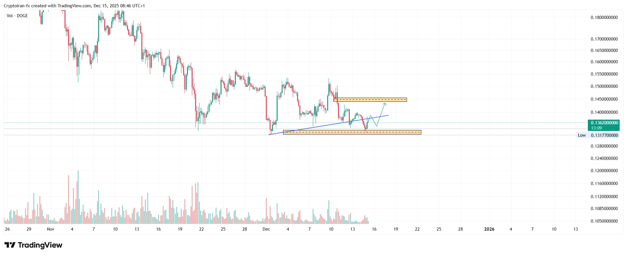 به تازگی شرکت گری اسکیل، صندوق ETF دوج کوین رو لیست کرده و گفته این میم کوین میتونه مورد توجه نهادها قرار بگیره. دوج کوین در تایم فریم ۴ ساعته به حمایت ۰.۱۳ دلار برخورد کرده و تونسته این سطح رو فعلا حفظ کنه. چون یک خط روند صعودی شکسته شده میتونیم بگیم لیکوییدیتی بزرگی بالای سطح ۰.۱۴ دلار شکل گرفته. اگه بیت کوین روند صعودی خودش رو شروع کنه، دوج کوین میتونه با افزایش تقاضای بزرگی مواجه بشه.