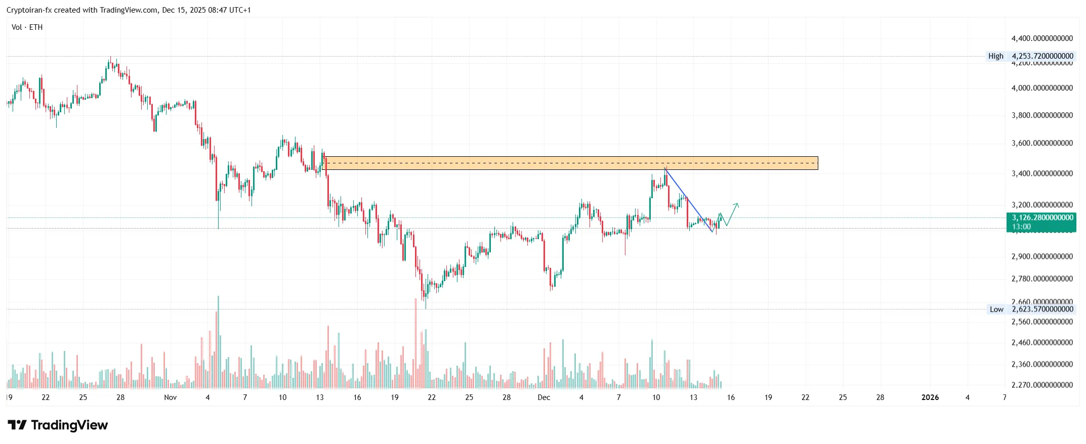 اتریوم بعد از رسیدن به مقاومت ۳۴۴۰ دلار با فشار فروش مواجه شد و مجدد به زیر سطح ۳۱۰۰ دلار اومد. در تایم فریم ۴ ساعته، قیمت در یک روند صعودی قرار داره و تونسته خط روند نزولی خودش رو بشکنه. اگه حمایت ۳۰۲۰ دلار حفظ بشه و قیمت بالای سطح ۳۱۰۰ دلار تثبیت بده، میتونیم به رشد احتمالی قیمت امیدوار باشیم. ناحیه ۳۲۰۰ تا ۳۳۰۰ دلار به عنوان یک مقاومت روانی و محدوده سل ساید به حساب میاد.