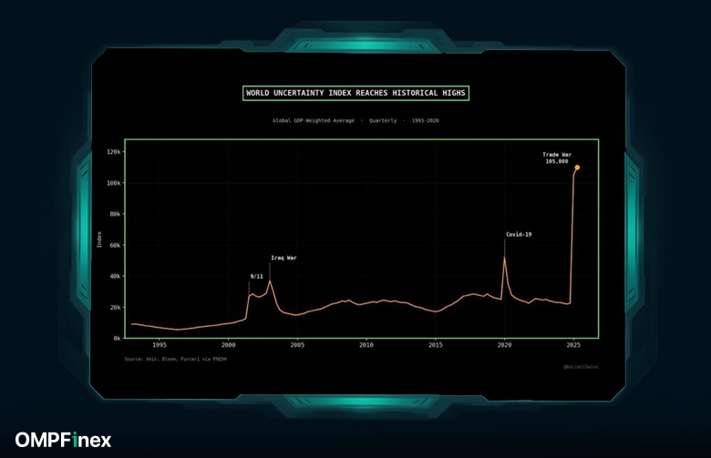 شاخص «عدم قطعیت جهانی» که نشان می‌دهد فضای اقتصادی و سیاسی جهان چقدر قابل‌پیش‌بینی است، به بالاترین سطح خود در تاریخ رسیده ‌است؛ سطحی که حتی از بحران ویروس جهانی کرونا، جنگ عراق و حادثه ۱۱ سپتامبر هم فراتر بوده و یک رقم بی‌سابقه را نمایش می‌دهد. چنین سطحی از ابهام، می‌تواند به‌طور مستقیم بازارهای مالی را نشانه بگیرد و آن‌ها را نیز دچار نوسان کند.